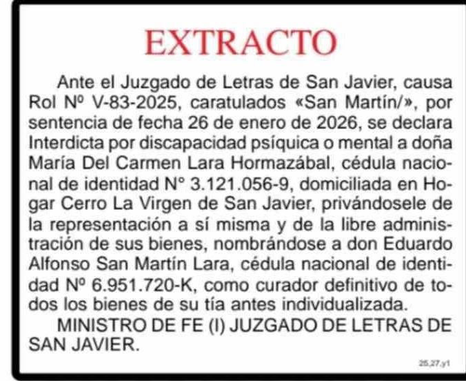 Título: Extractos: EXTRACTO Ante el Juzgado de Letras de San Javier, causa Rol Nº V-83-2025, caratulados «San Martín/», por sentencia de fecha 26 de enero de 2026, se declara Interdicta por discapacidad psíquica o mental a doña María Del Carmen Lara Hormazábal, cédula nacional de identidad Nº 3.121.056-9, d