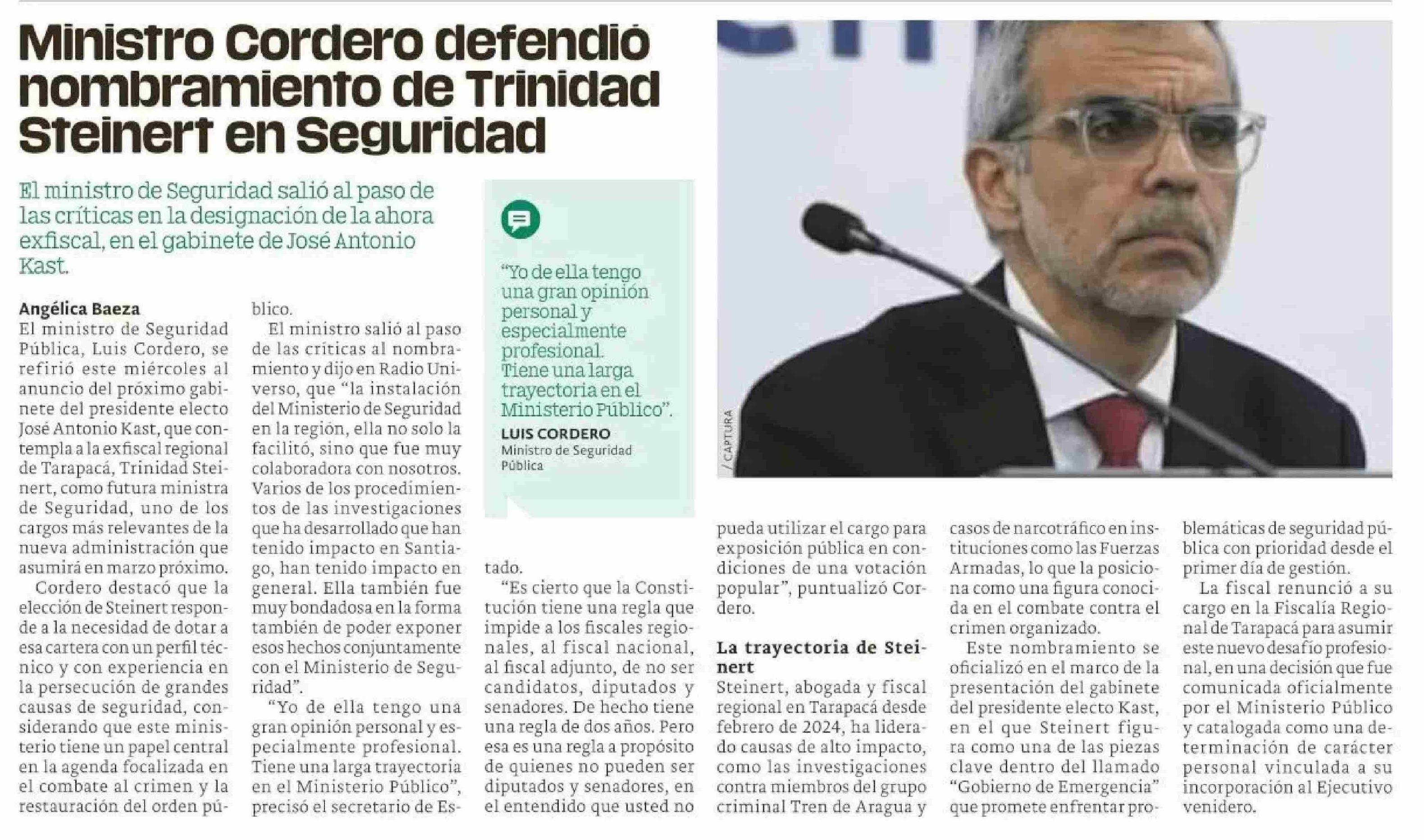 Ministro Cordero defendió nombramiento de Trinidad Steinert en Seguridad