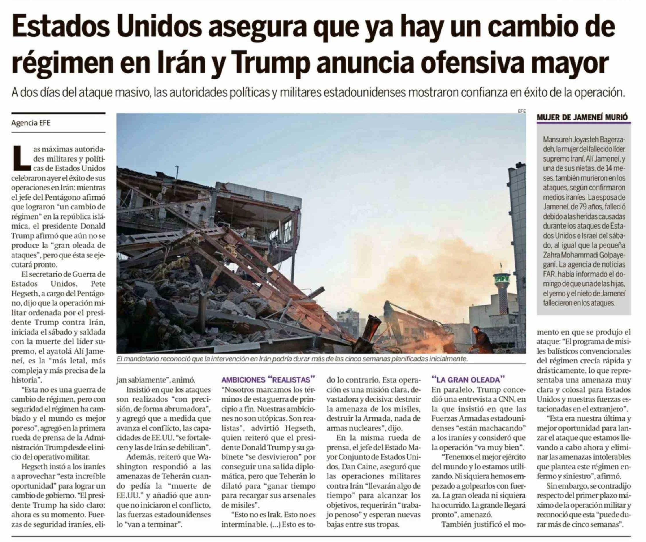 Estados Unidos asegura que ya hay un cambio de régimen en Iran y Trump anuncia ofensiva mayor