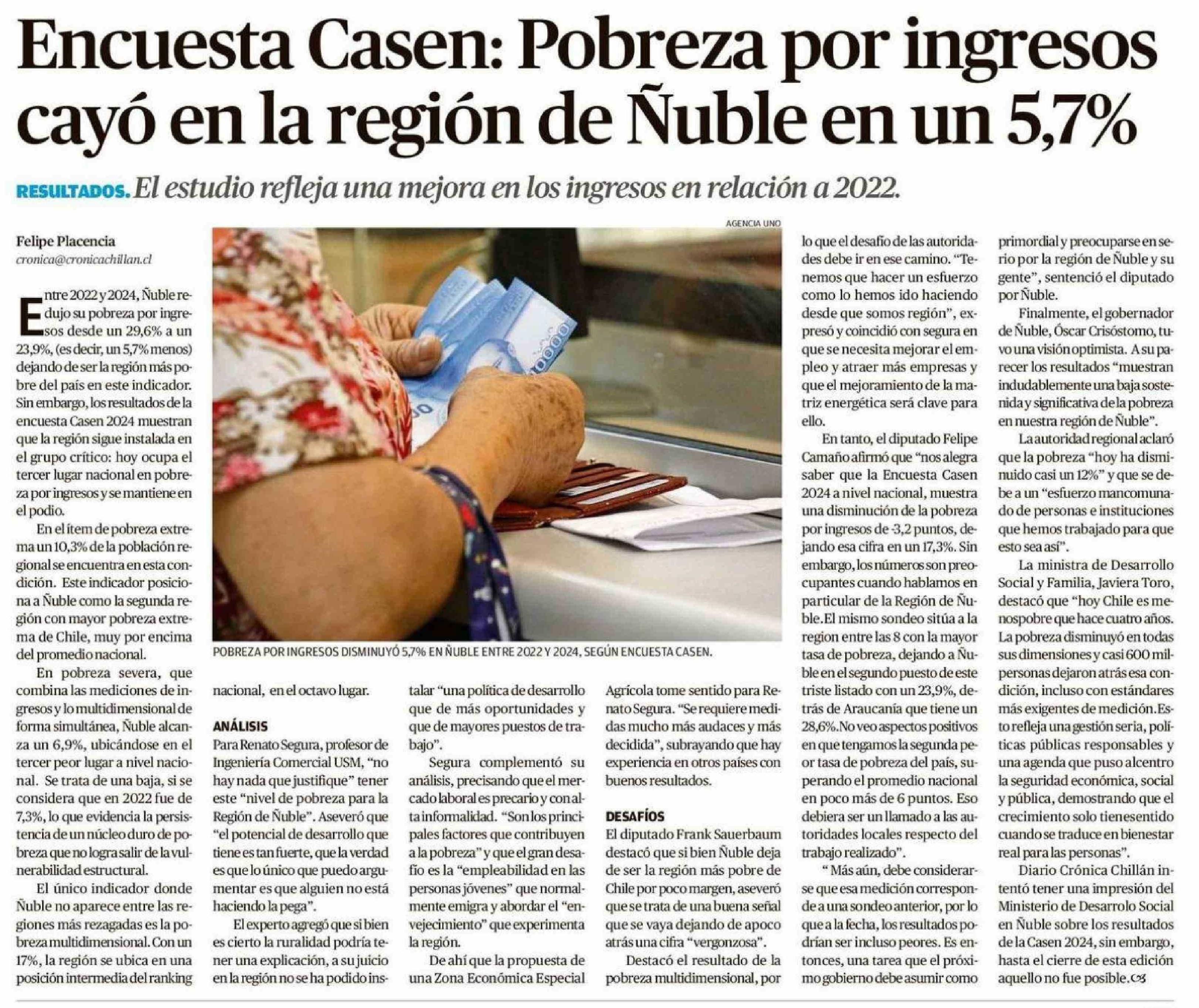 Encuesta Casen: Pobreza por ingresos cayó en la región de Nuble en un 5,7%