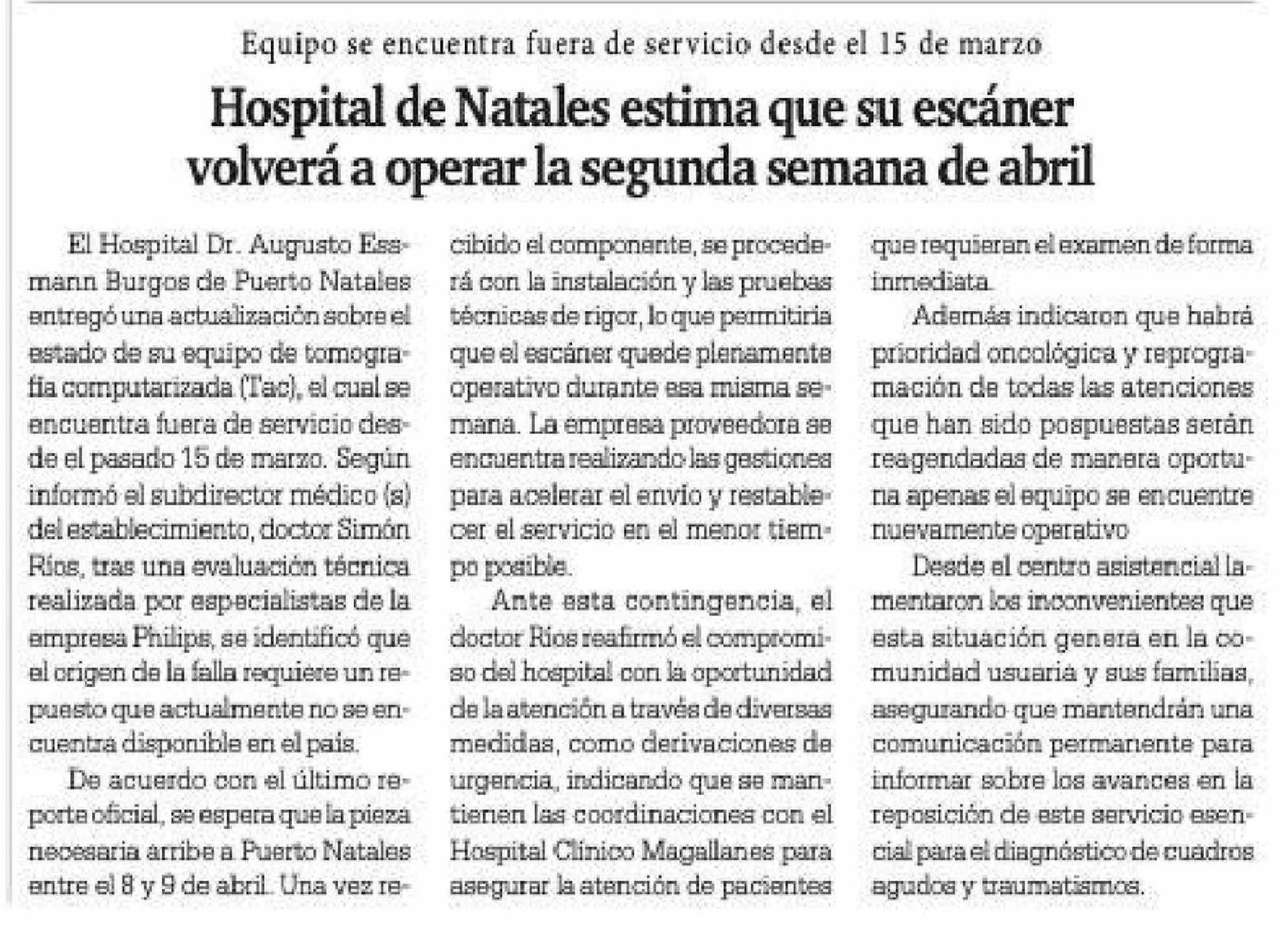 Hospital de Natales estima que su escáner volverá a operar la segunda semana de abril