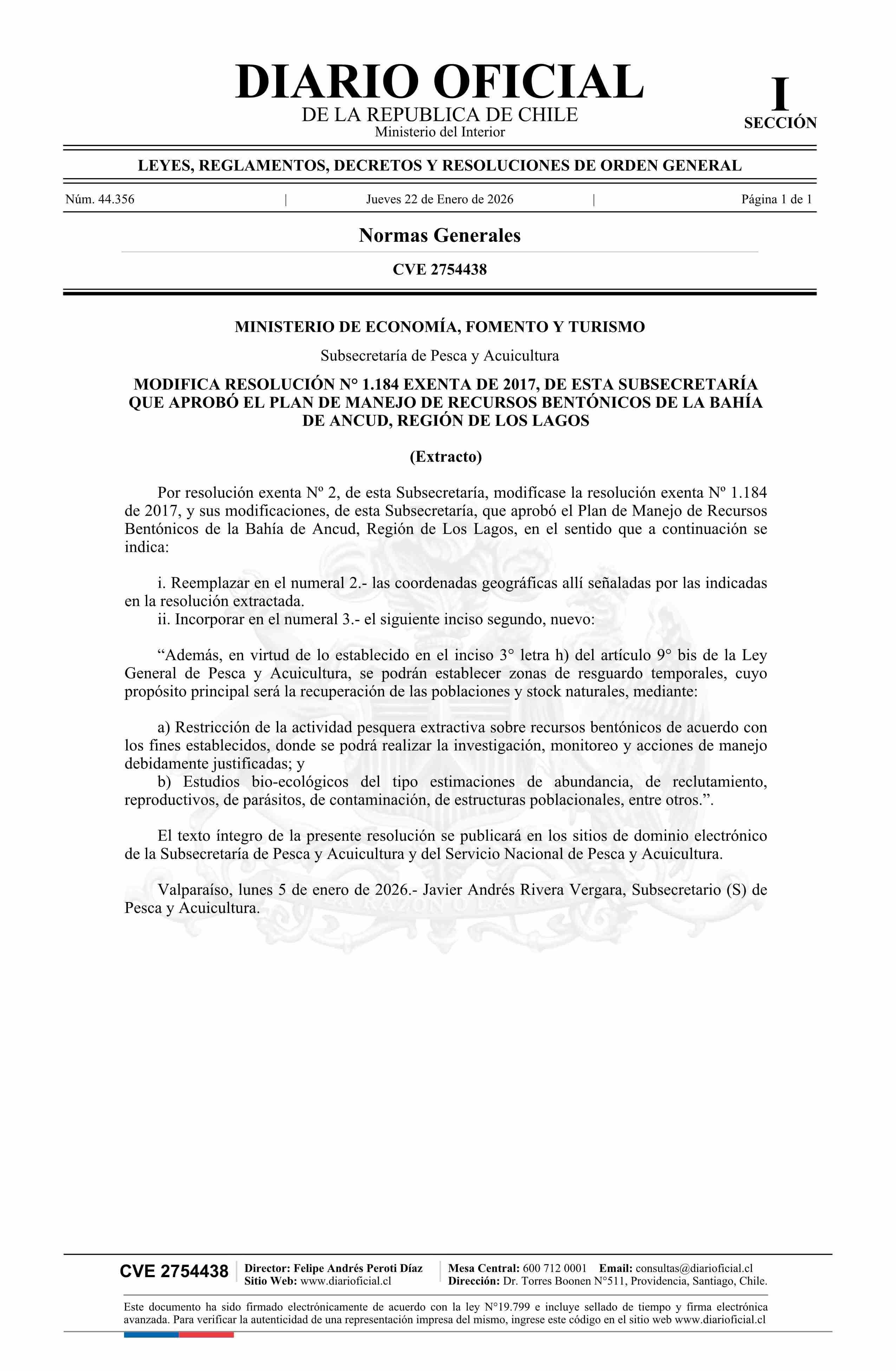 | Título: | Extracto de resolución exenta número 2, de 2026.- Modifica resolución N° 1.184 exenta de 2017, que aprobó el Plan de manejo de recursos bentónicos de la bahía de Ancud, Región de Los Lagos |