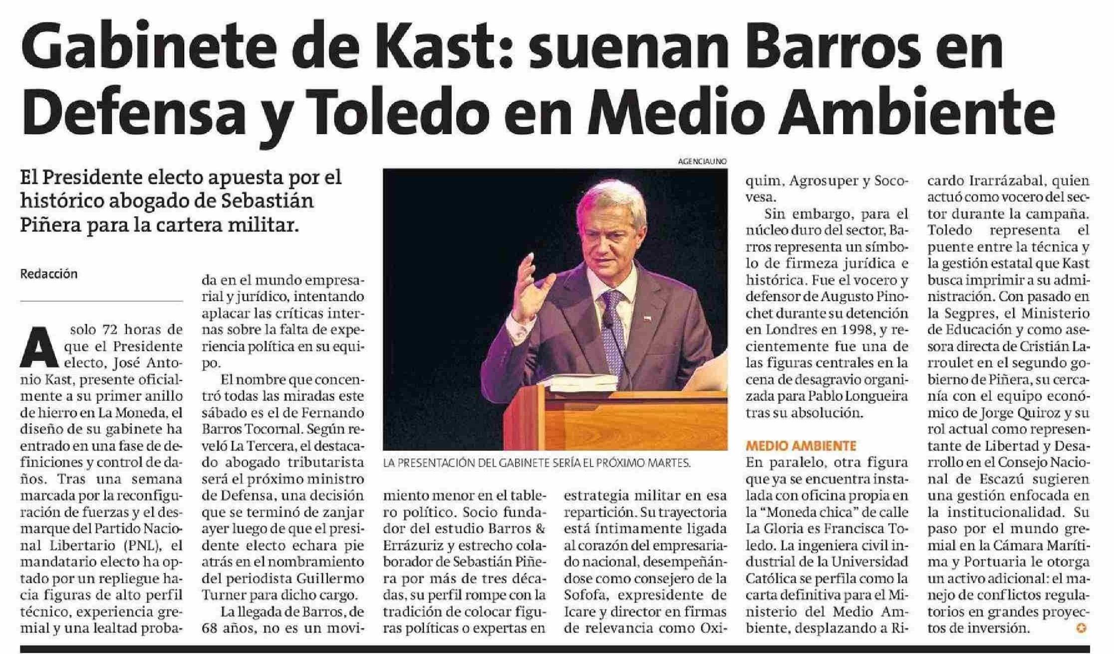 Gabinete de Kast: suenan Barros en Defensa y Toledo en Medio Ambiente