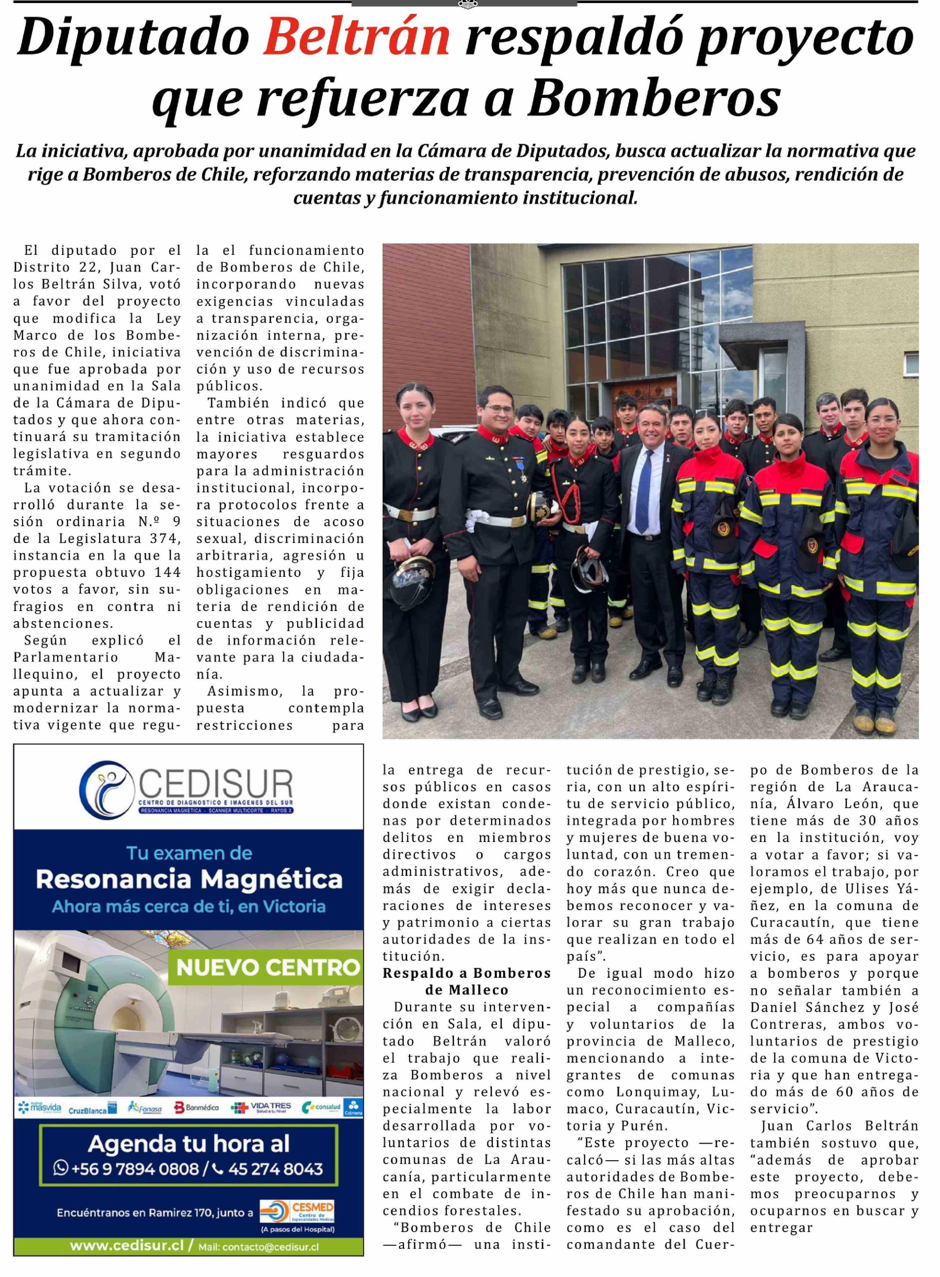 Diputado Beltrán respaldó proyecto que refuerza a Bomberos