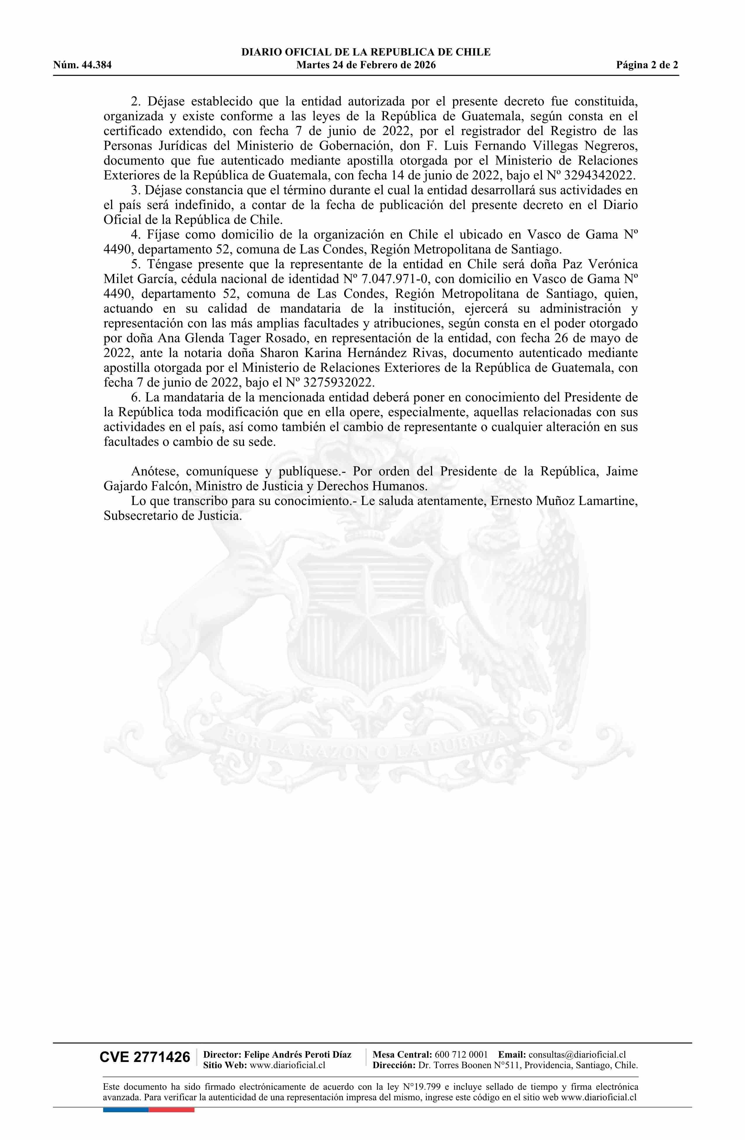 | Título: | Decreto exento número 371, de 2026.- Autoriza a la entidad denominada Alianza para la Paz ONG para desarrollar actividades en el país |