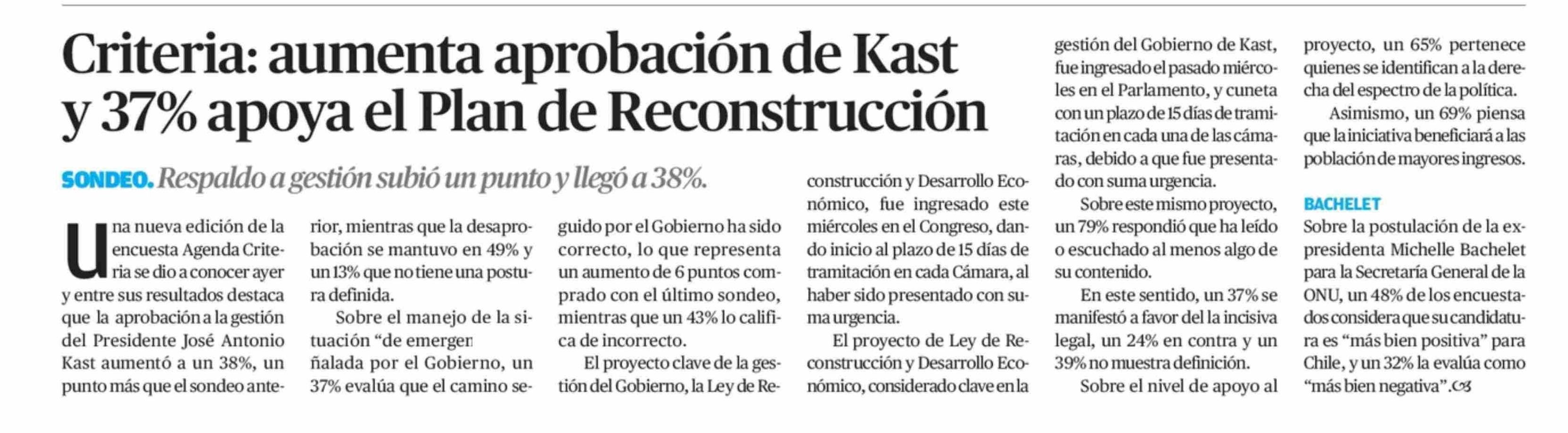 Criteria: aumenta aprobación de Kast y 37% apoya el Plan de Reconstrucción