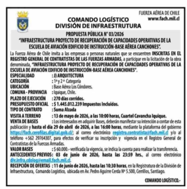 Título: Aviso Licitaciones: FUERZA AÉREA DE CHILE COMANDO LOGÍSTICO DIVISIÓN DE INFRAESTRUTURA PROPUESTA PÚBLICA N° 03/2026
