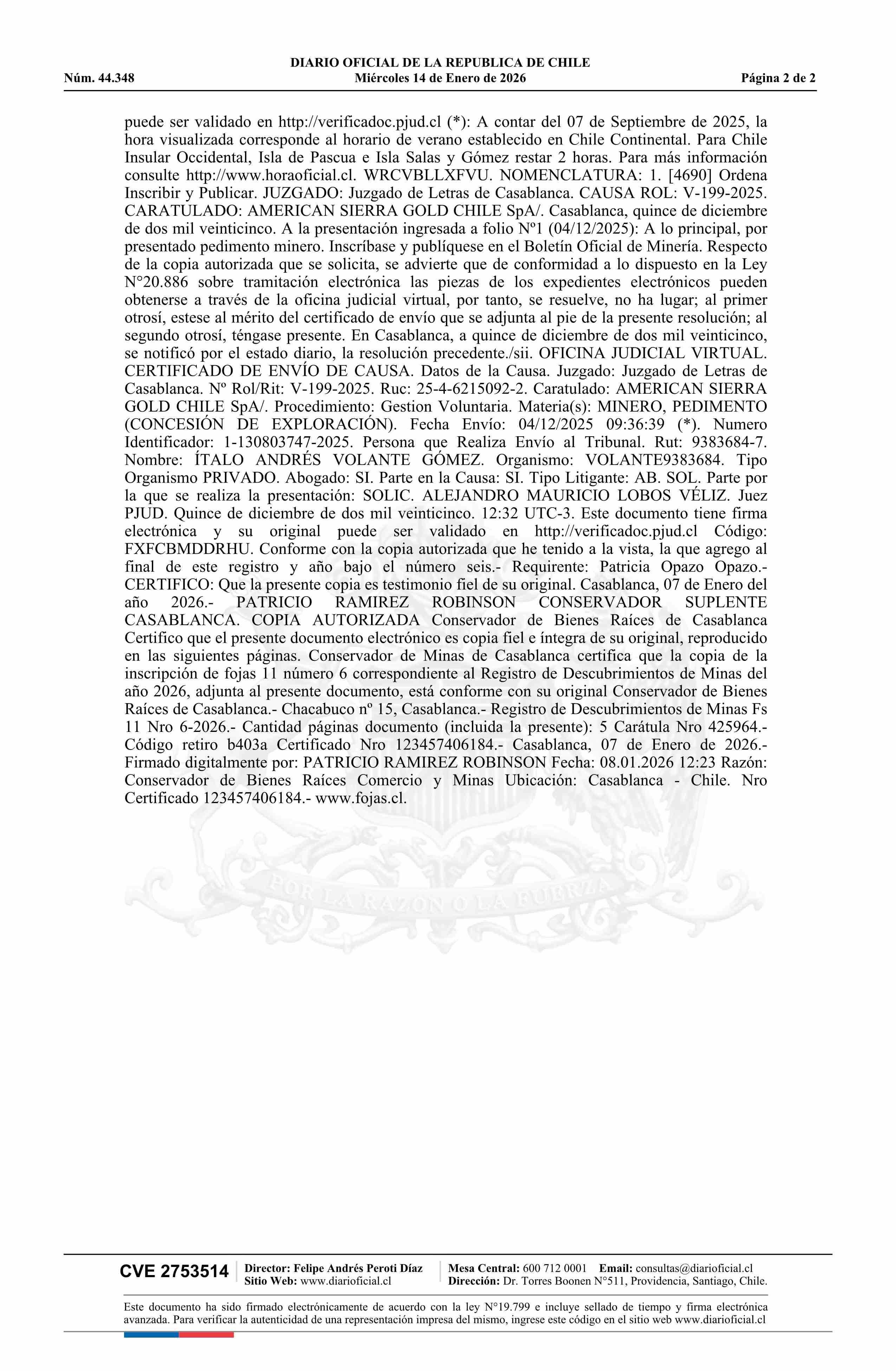 DIARIO OFICIAL CHILE - BOLETÍN OFICIAL DE MINERÍA (DIARIO OFICIAL CHILE – BOM – PEDIMENTOS MINEROS)