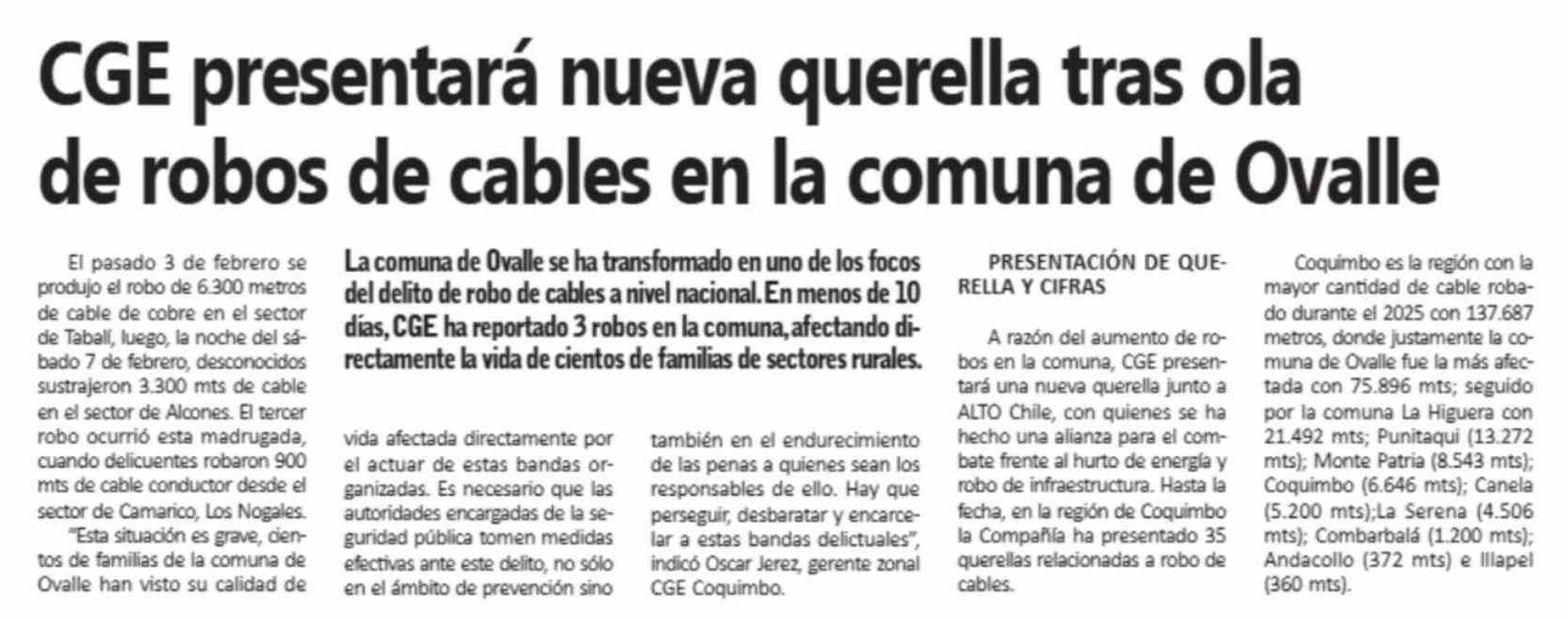 CGE presentará nueva querella tras ola de robos de cables en la comuna de Ovalle