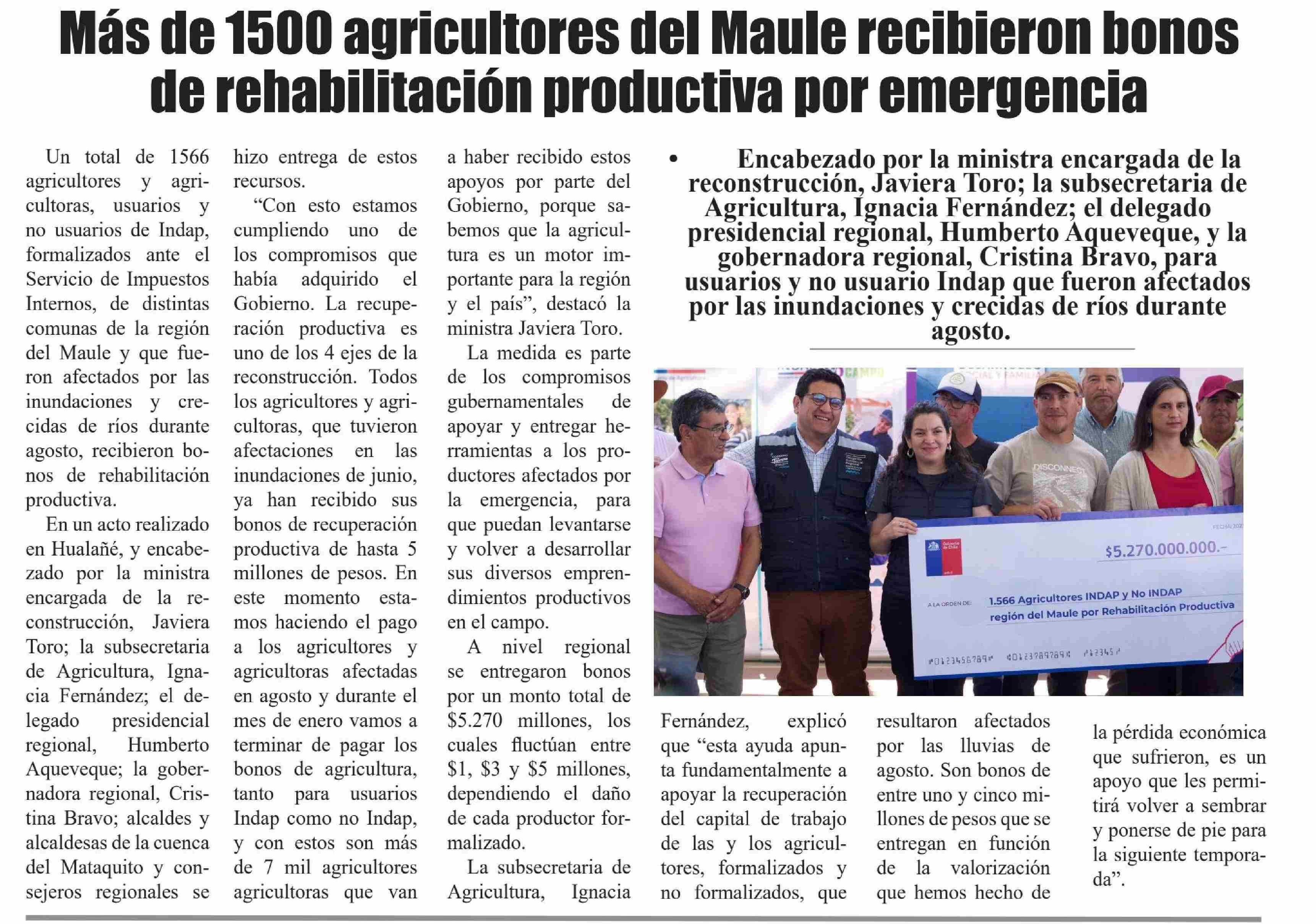 Más de 1500 agricultores del Maule recibieron bonos de rehabilitación productiva por emergencia