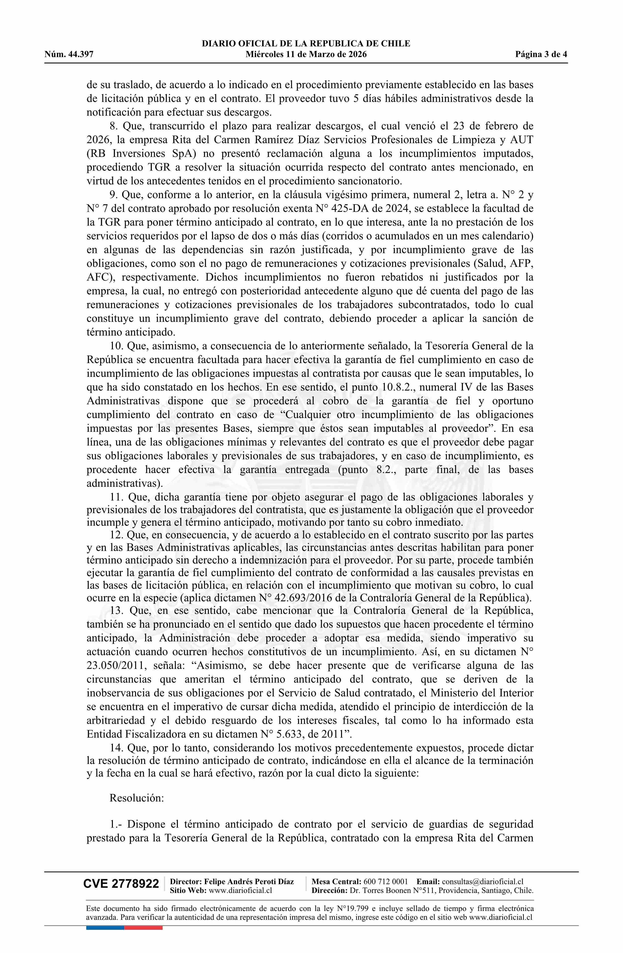 | Título: | Resolución exenta número 601-DA, de 2026.- Aprueba término anticipado de contrato de prestación de servicios de guardias de seguridad, suscrito entre la Tesorería General de la República y Rita del Carmen Ramírez Díaz Servicios Profesionales de Limpieza y Aut |