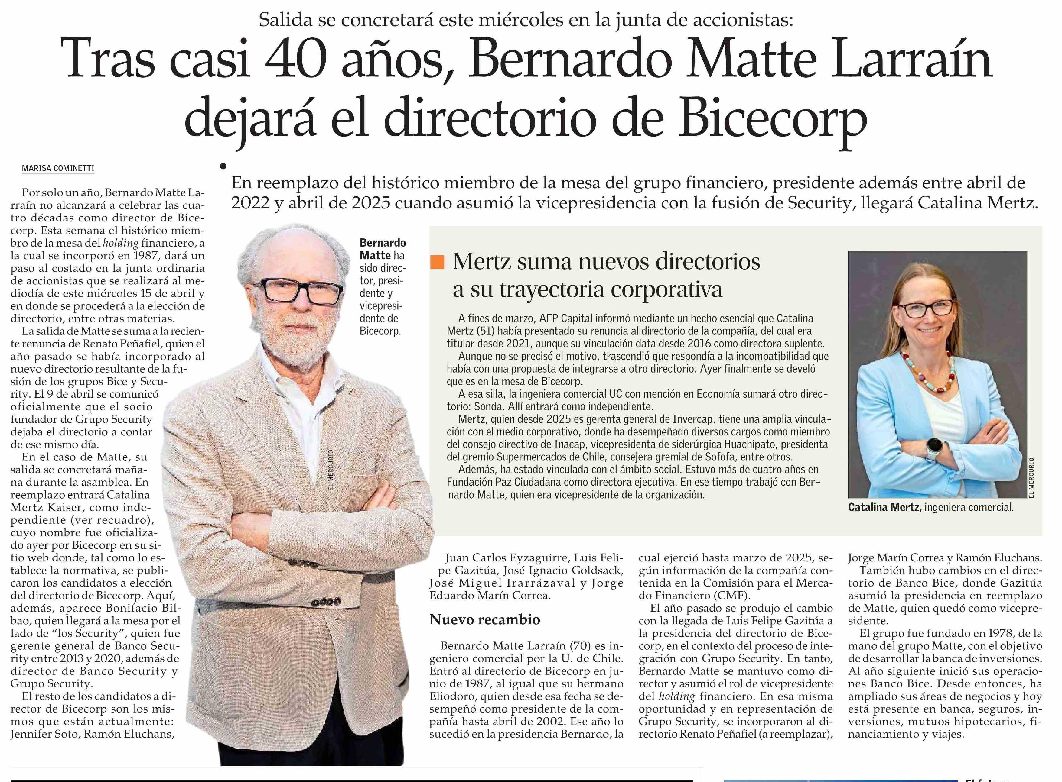 Título: Tras casi 40 años, Bernardo Matte Larraín dejará el directorio de Bicecorp
