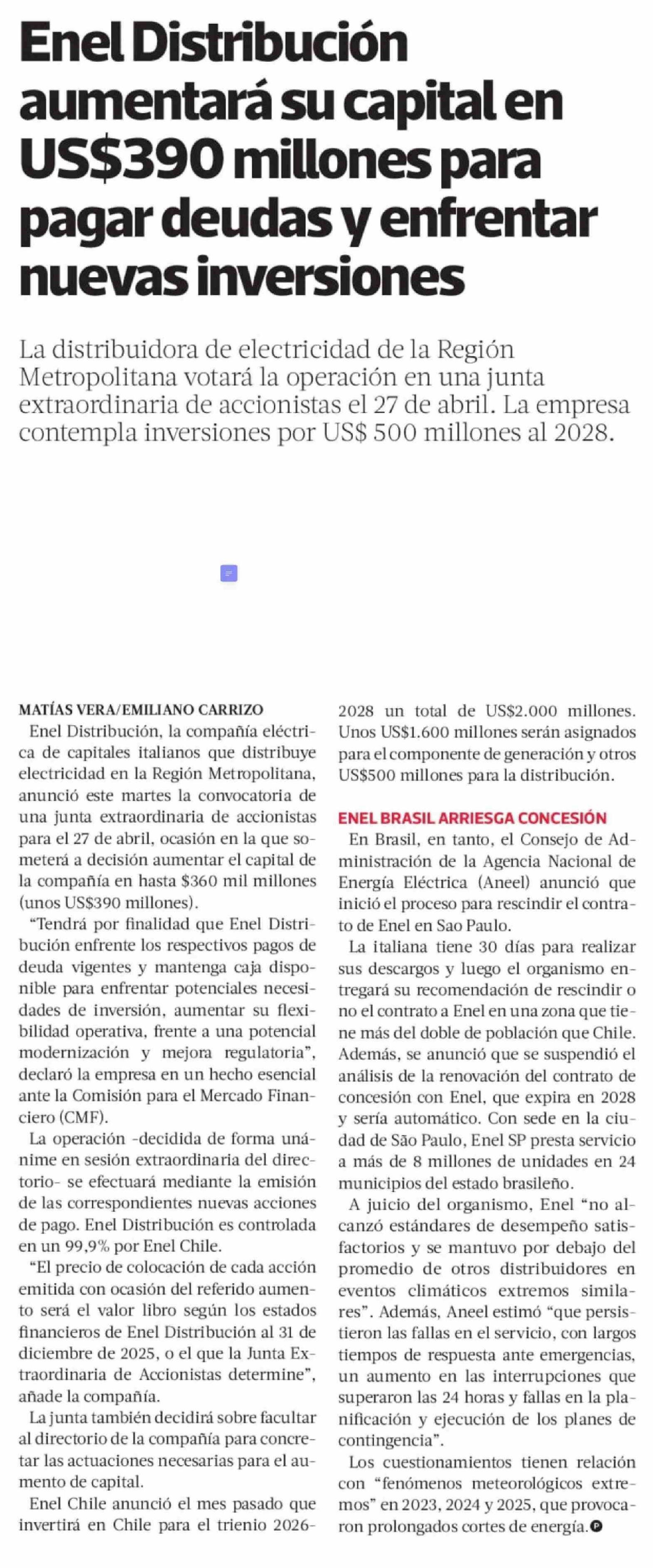 Enel Distribución aumentará su capital en US$390 millones para pagar deudas y enfrentar nuevas inversiones