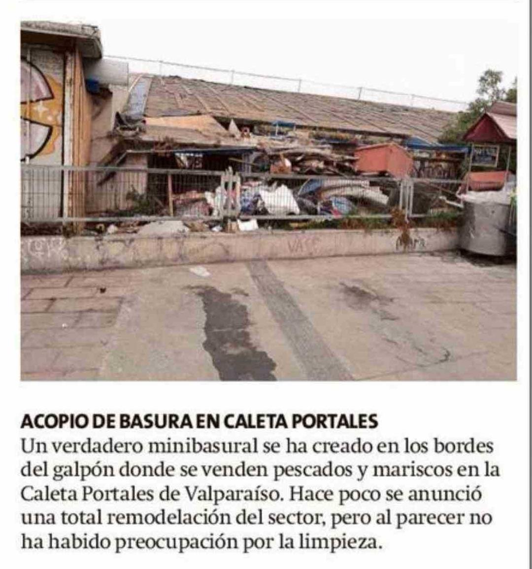 Título: ACOPIO DE BASURA EN CALETA PORTALES Un verdadero minibasural se ha creado en los bordes del galpón donde se venden pescados y mariscos en la Caleta Portales de Valparaíso. Hace poco se anunció una total remodelación del sector, pero al parecer no ha habido preocupación por la limpieza.