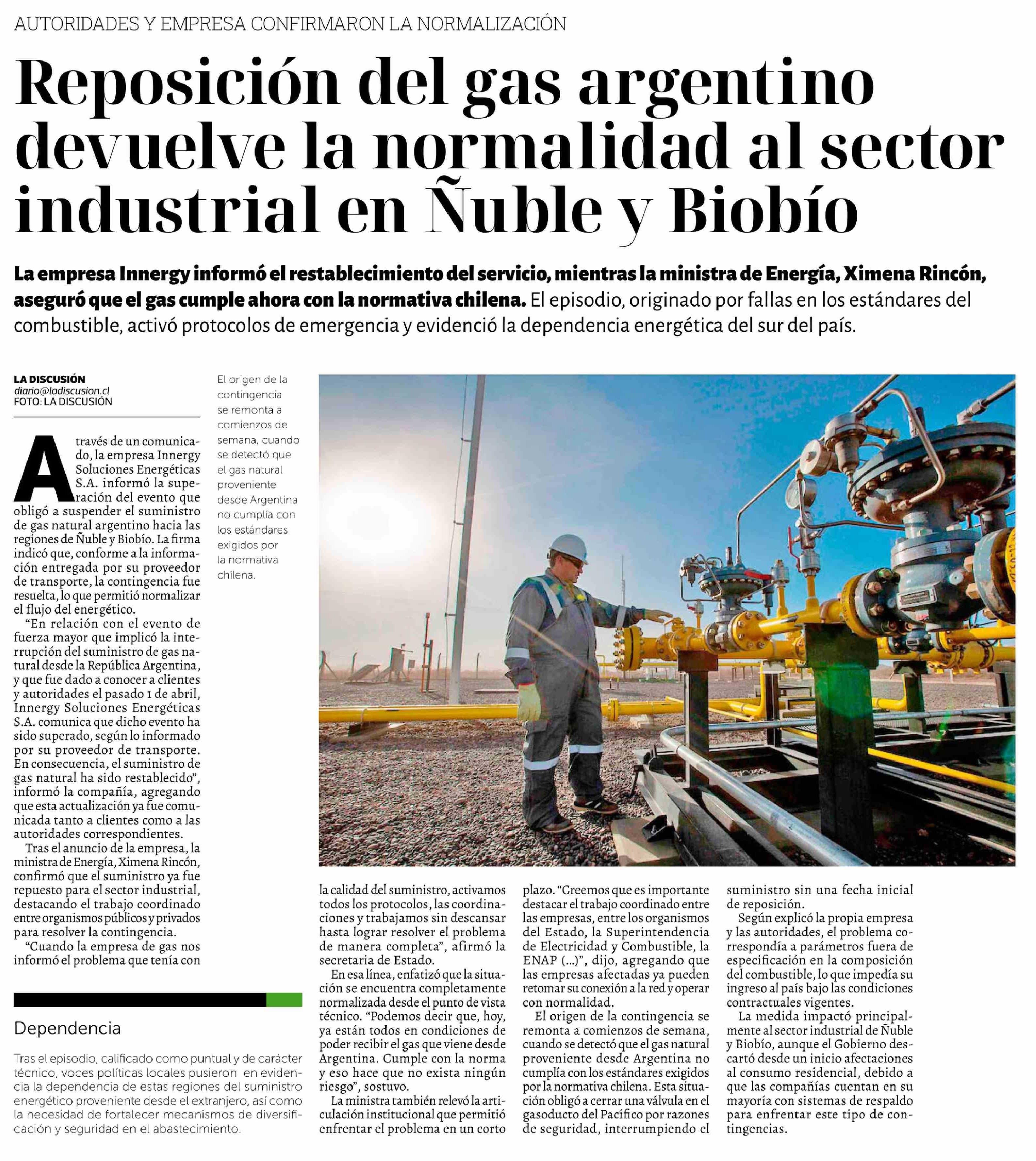 Reposición del gas argentino devuelve la normalidad al sector industrial en Nuble y Biobío