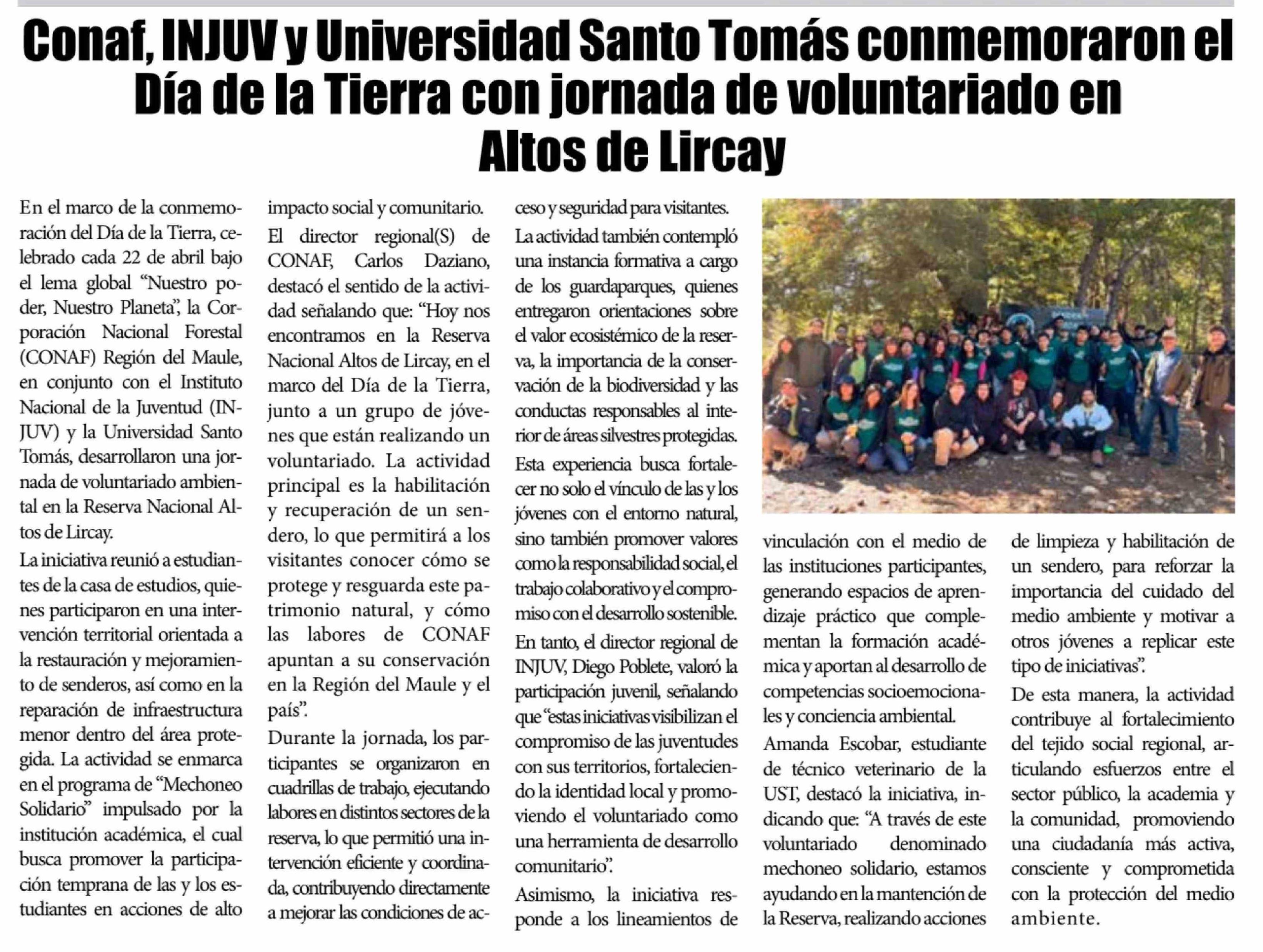 Conaf, INJUV y Universidad Santo Tomás conmemoraron el Día de la Tierra con jornada de voluntariado en Altos de Lircay