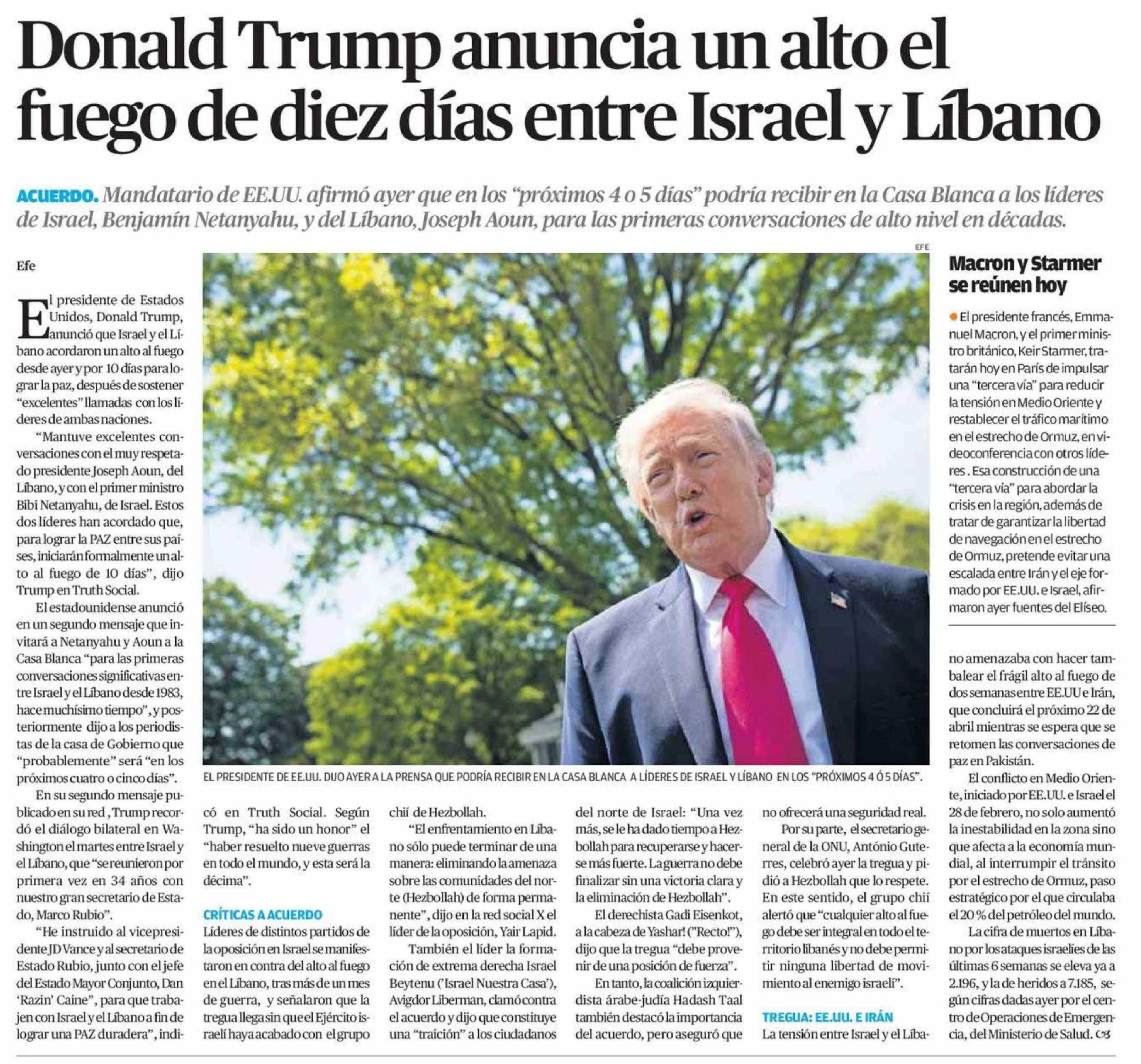 Título: Donald Trump anuncia un alto el fuego de diez días entre Israel y Líbano