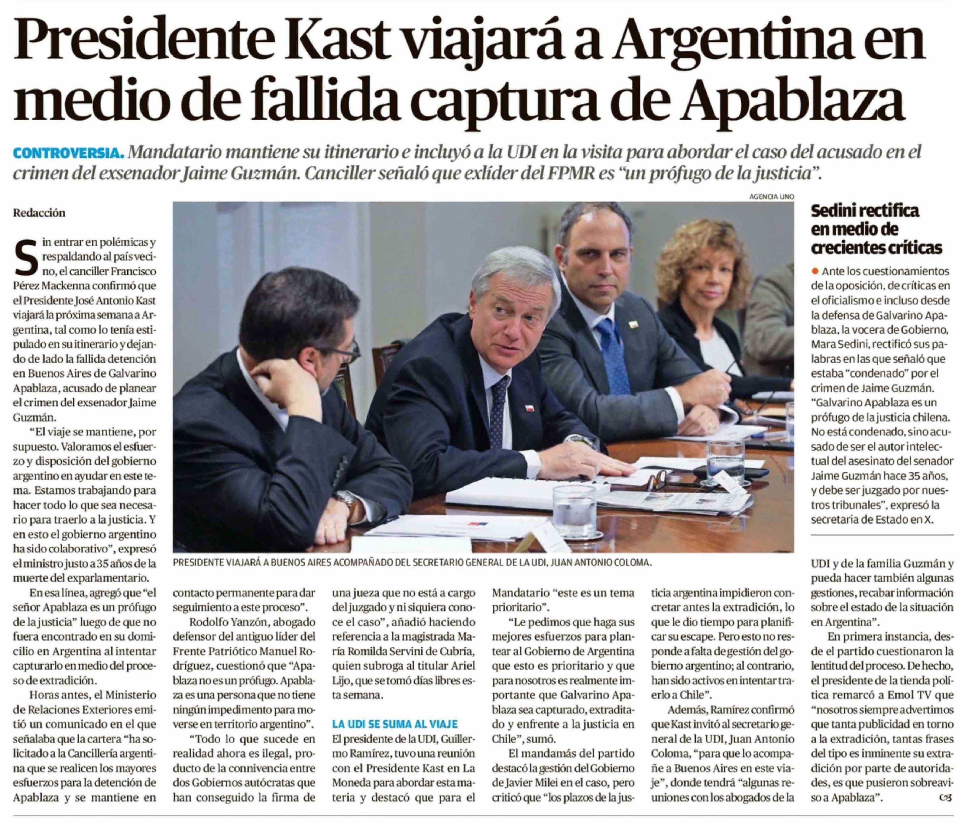 Presidente Kast viajará a Argentina en medio de fallida captura de Apablaza