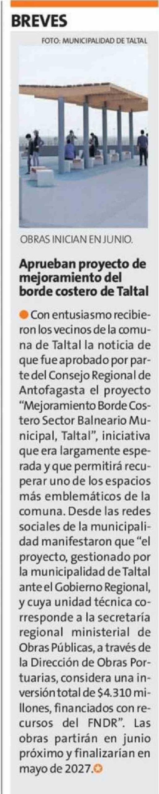 Aprueban proyecto de mejoramiento del borde costero de Taltal