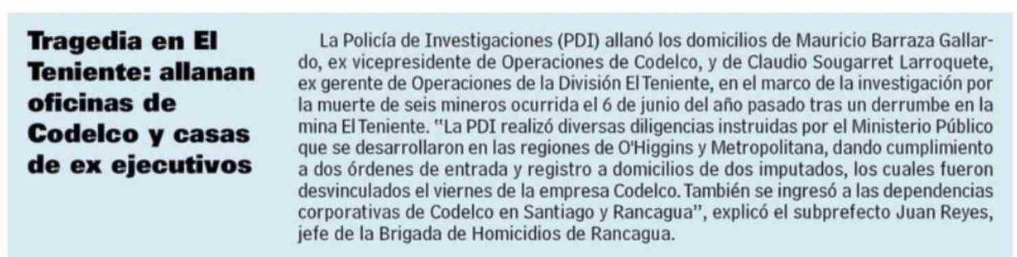 Tragedia en El Teniente: allanan oficinas de Codelco y casas de ex ejecutivos