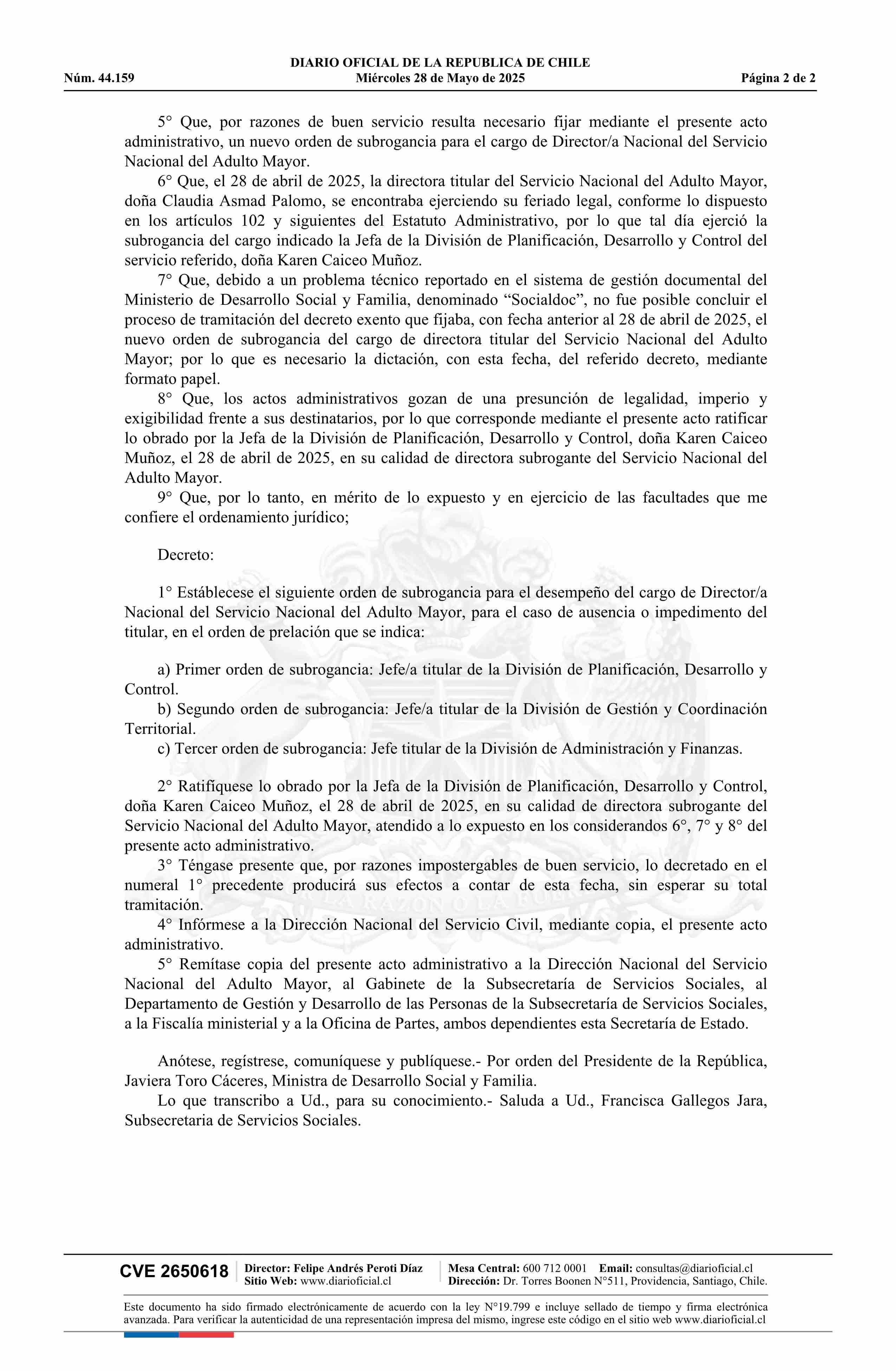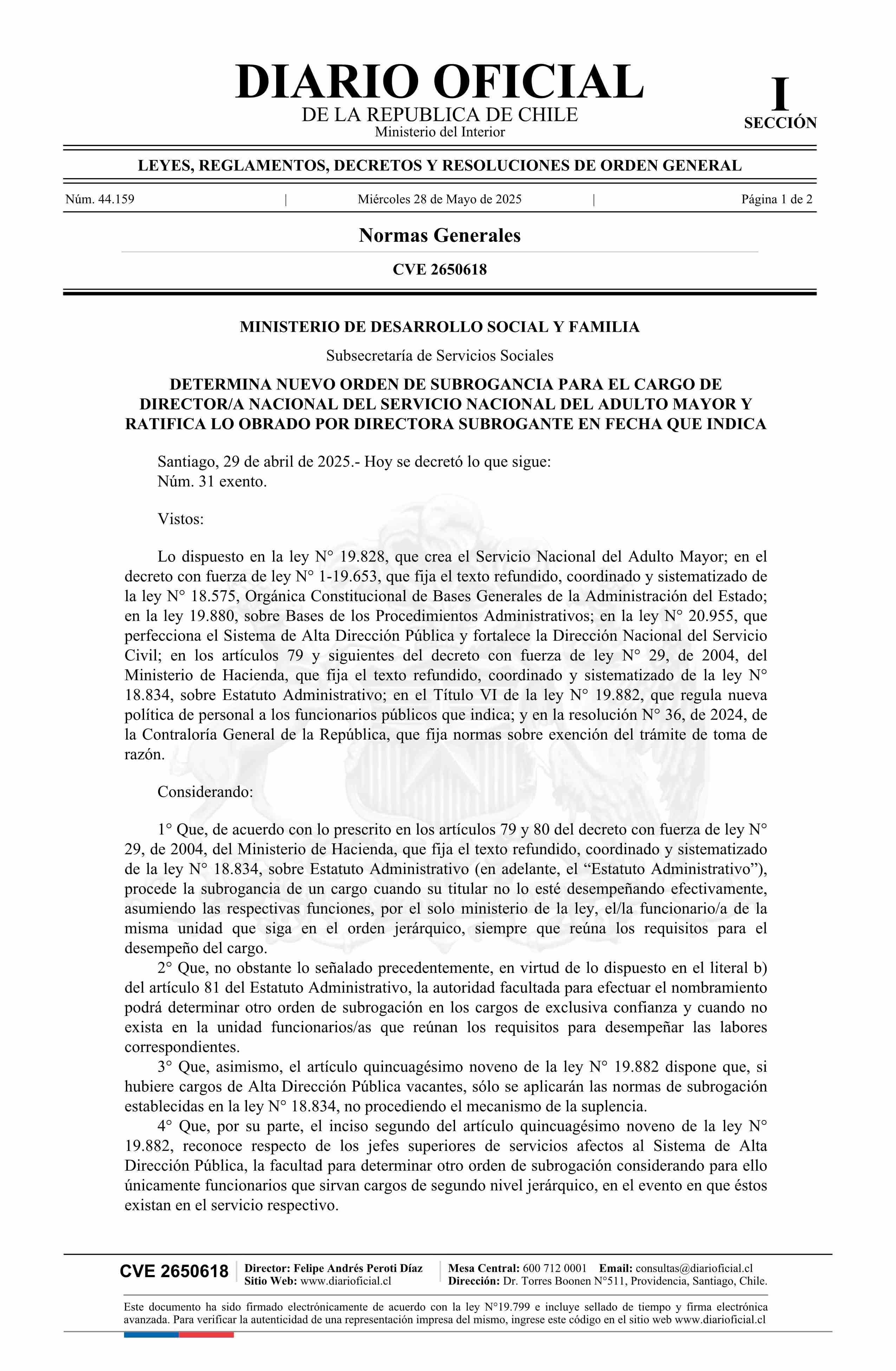 | Título: | Decreto exento número 31, de 2025.- Determina nuevo orden de subrogancia para el cargo de Director/a Nacional del Servicio Nacional del Adulto Mayor y ratifica lo obrado por Directora subrogante en fecha que indica |