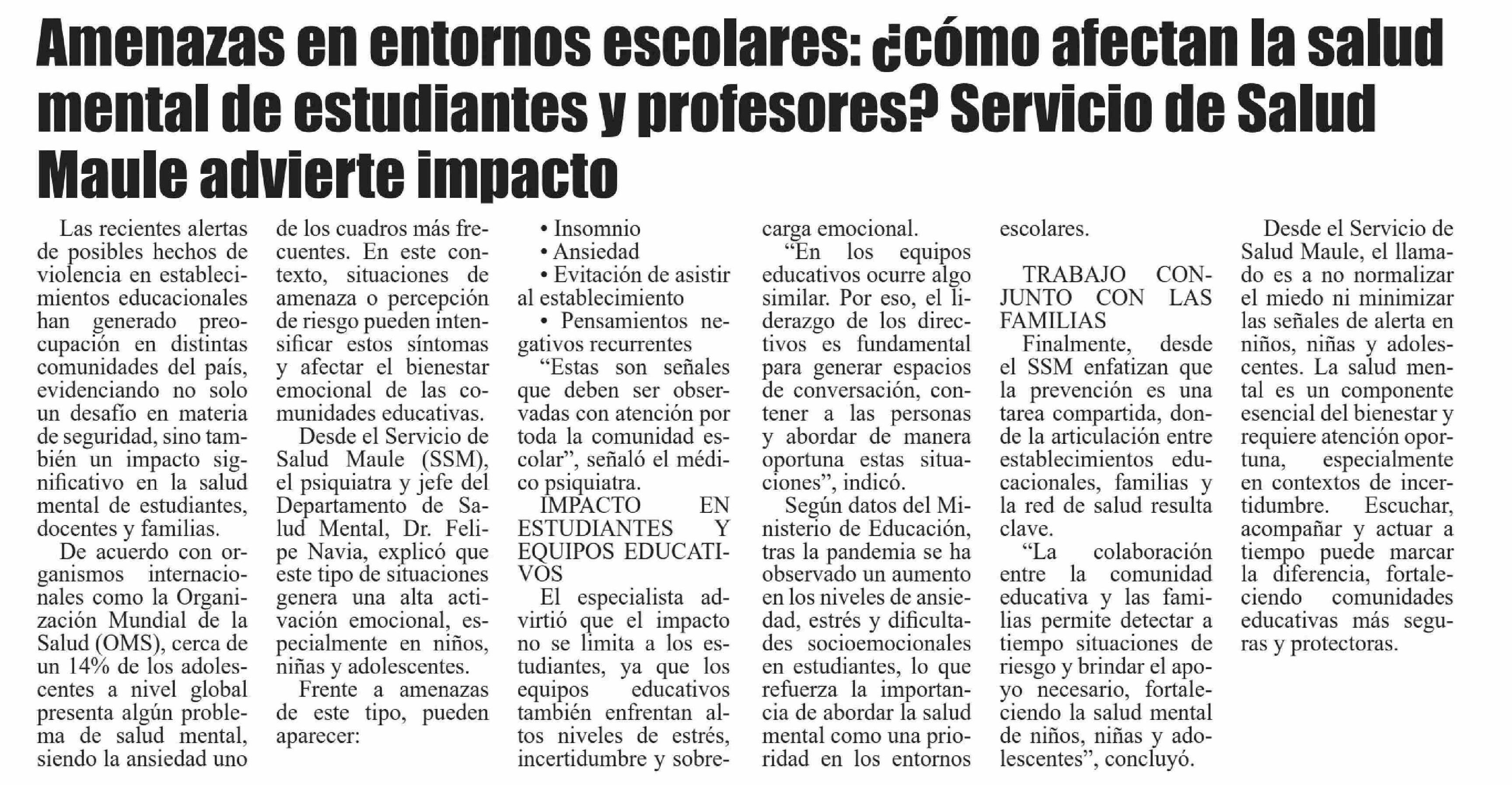 Amenazas en entornos escolares: ¿cómo afectan la salud mental de estudiantes y profesores? Servicio de Salud Maule advierte impacto