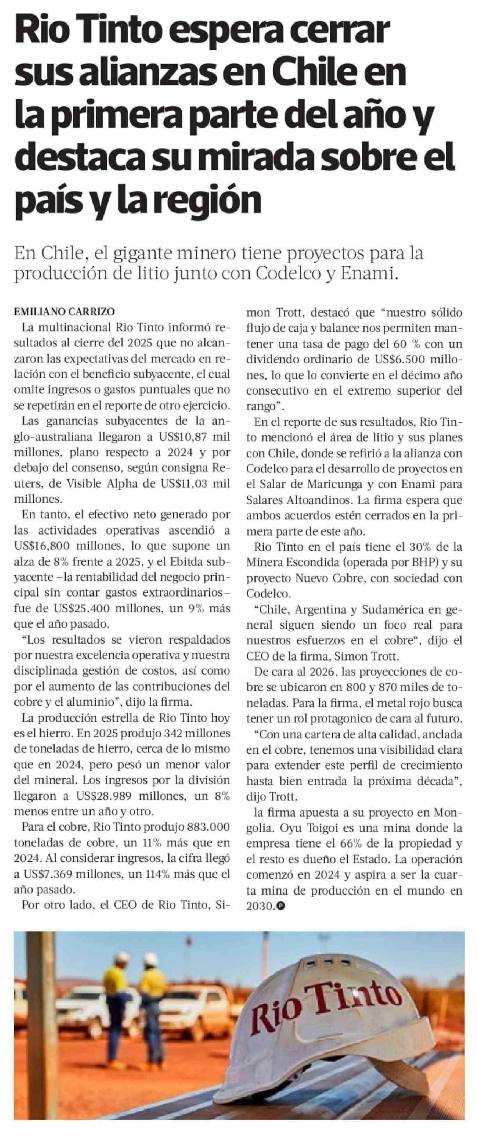 Rio Tinto espera cerrar sus alianzas en Chile en la primera parte del año y destaca su mirada sobre el país y la región