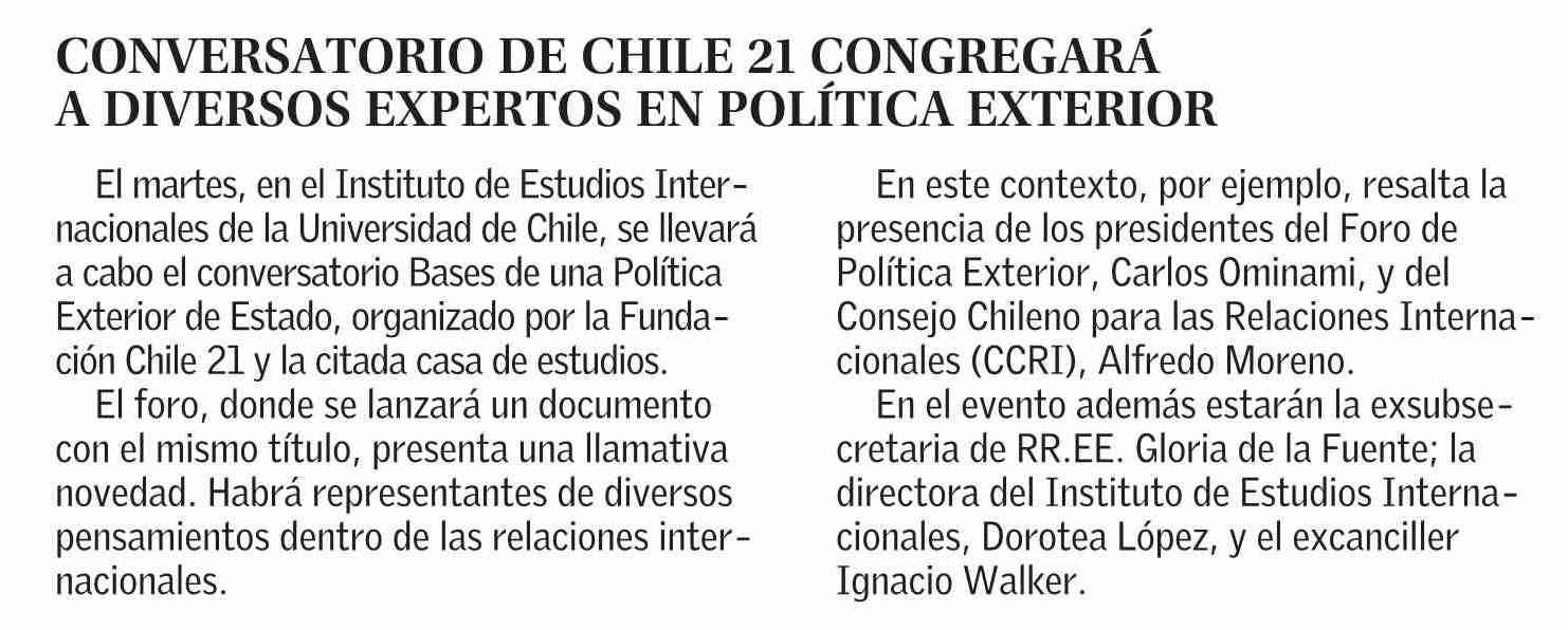 CONVERSATORIO DE CHILE 21 CONGREGARÁ A DIVERSOS EXPERTOS EN POLÍTICA EXTERIOR