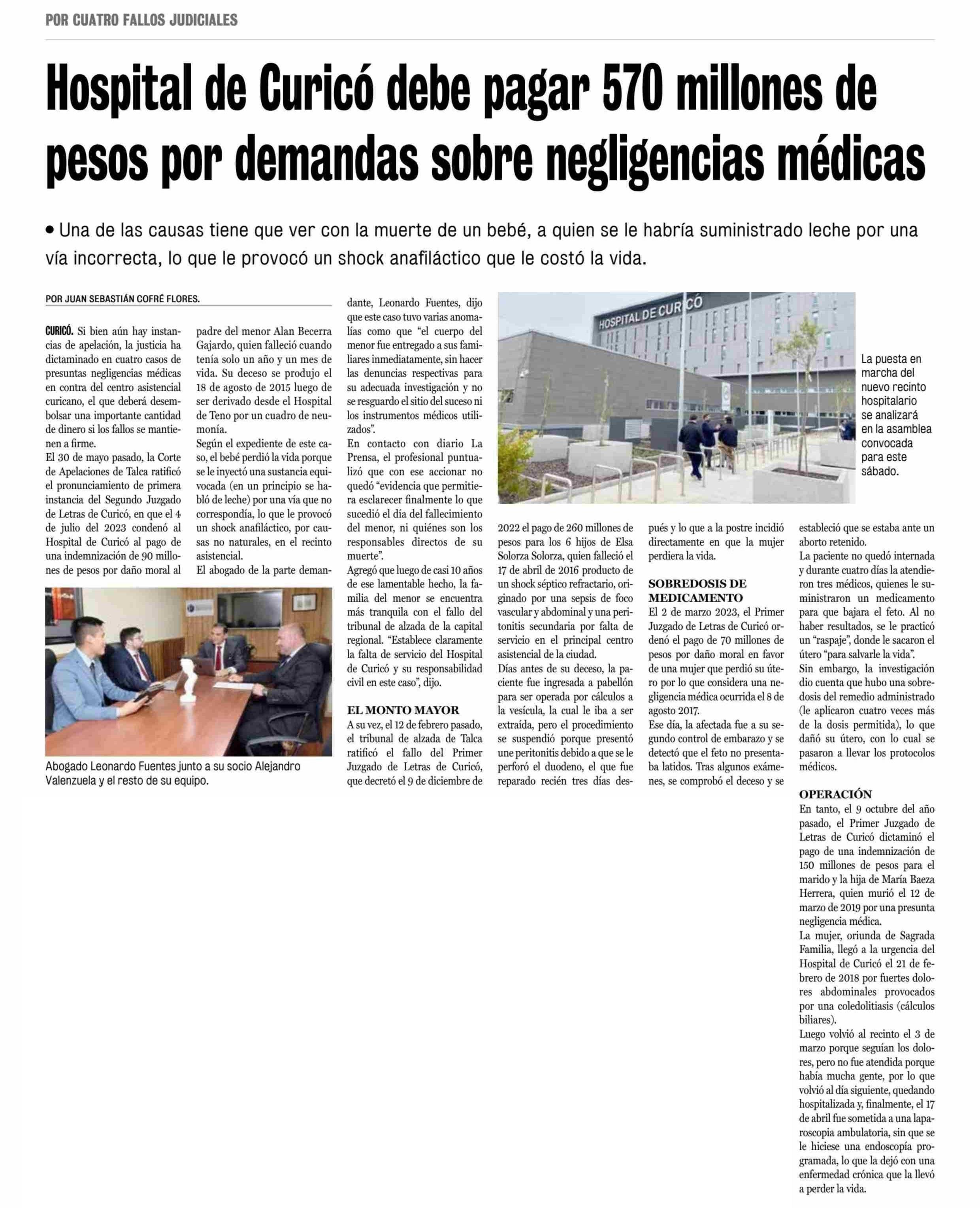 Hospital de Curicó debe pagar 570 millones de pesos por demandas sobre negligencias médicas