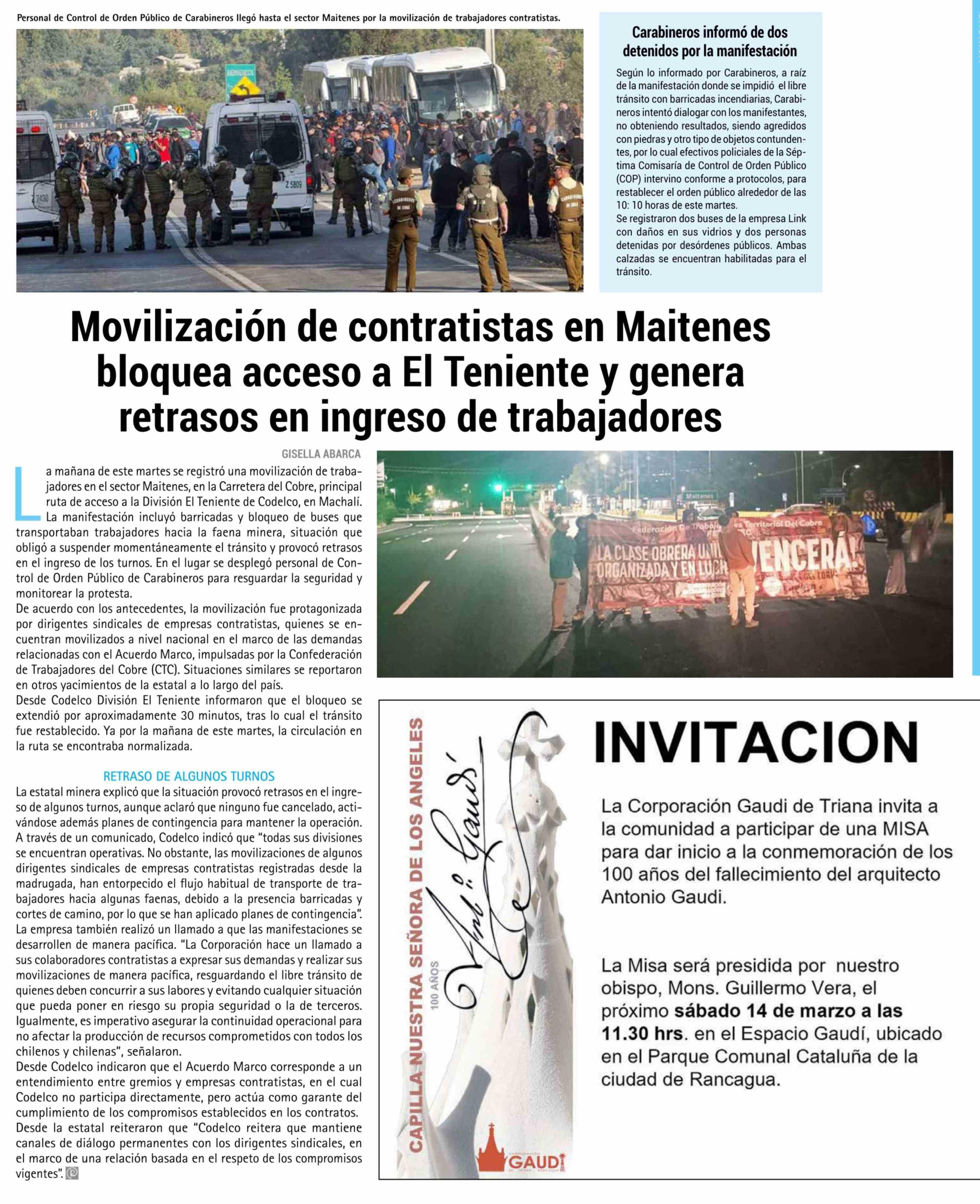 Movilización de contratistas en Maitenes bloquea acceso a El Teniente y genera retrasos en ingreso de trabajadores