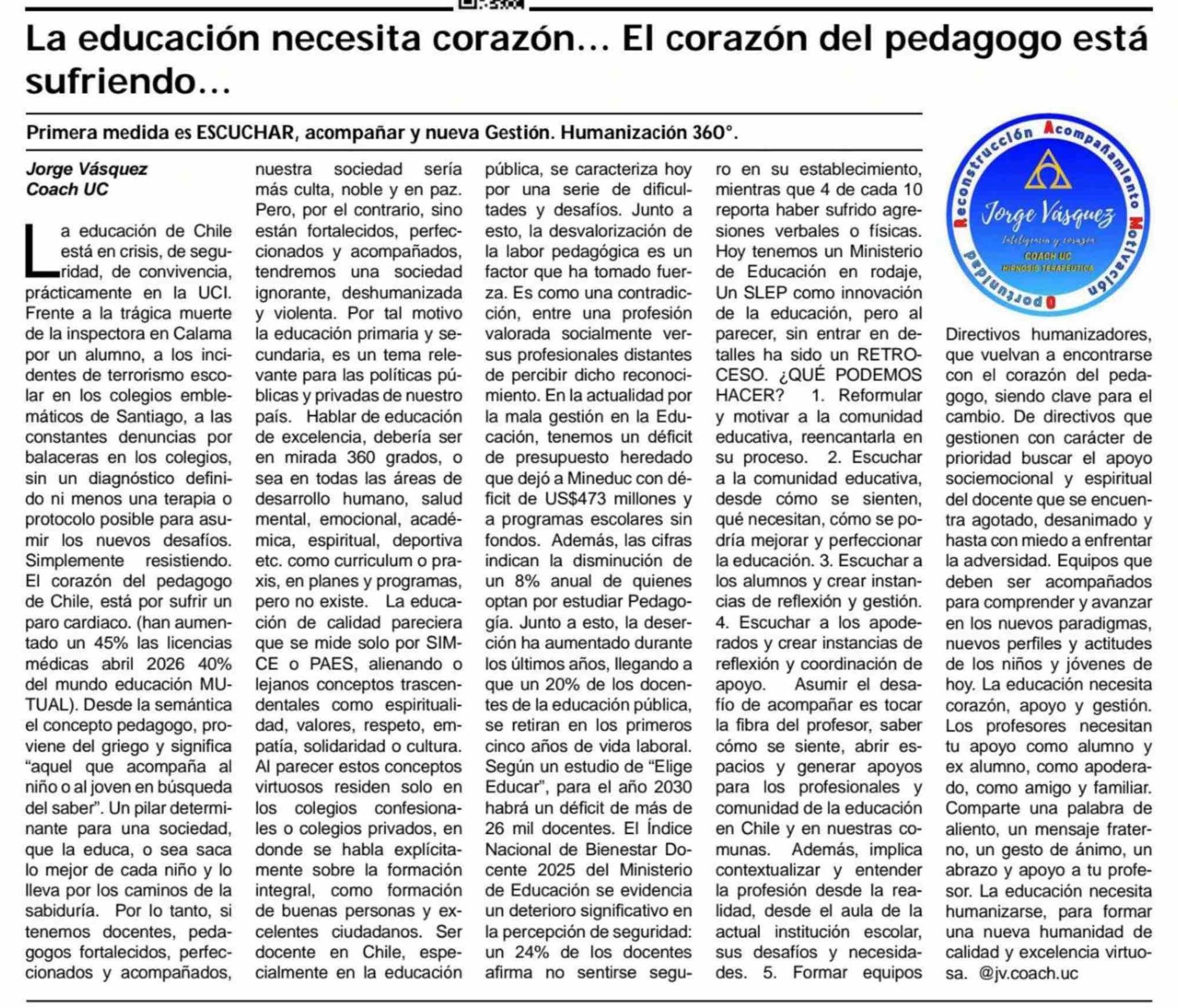 Título: Columnas de Opinión: La educación necesita corazón ... El corazón del pedagogo está sufriendo ...