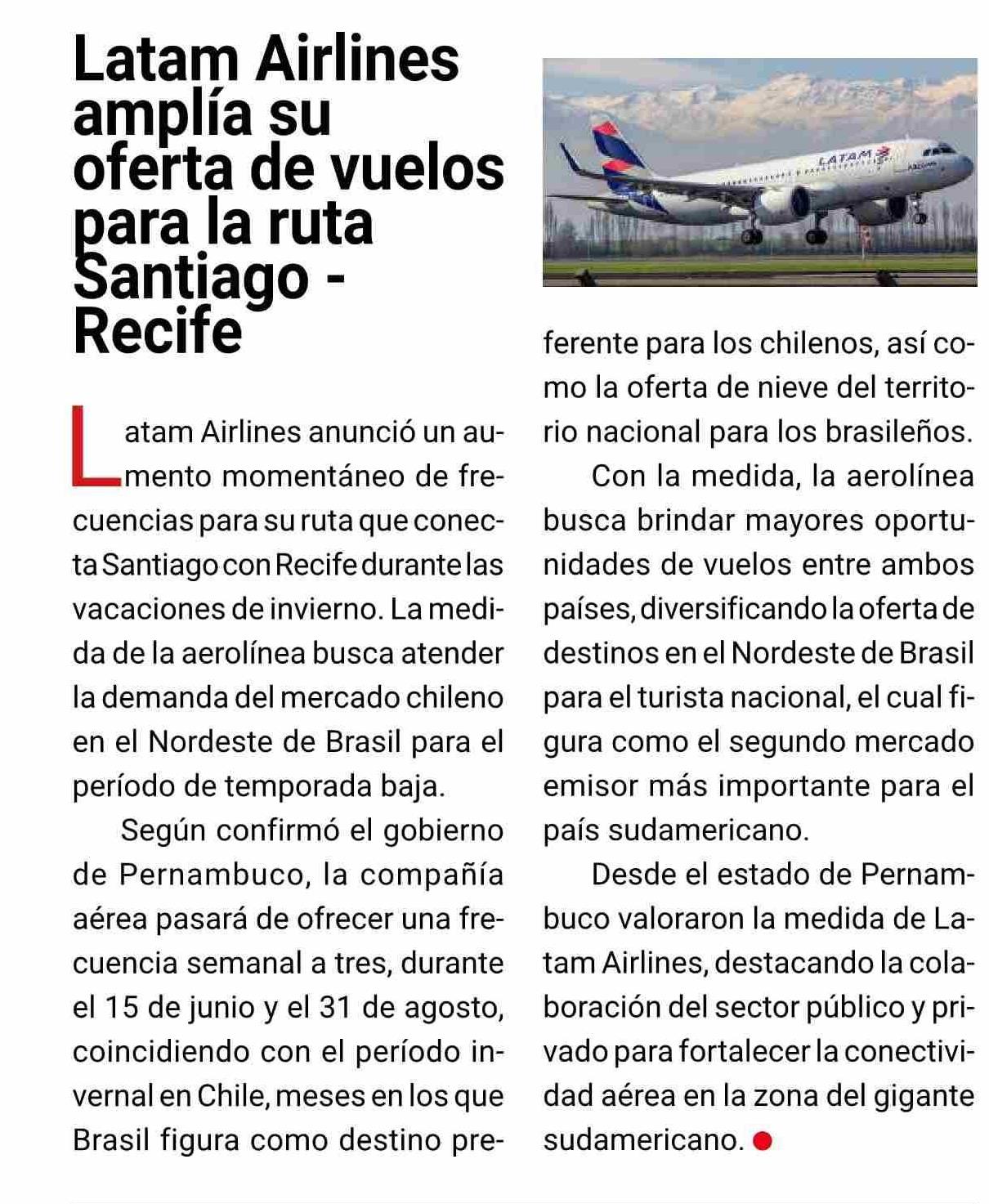 Latam Airlines amplía su oferta de vuelos para la ruta Santiago Recife