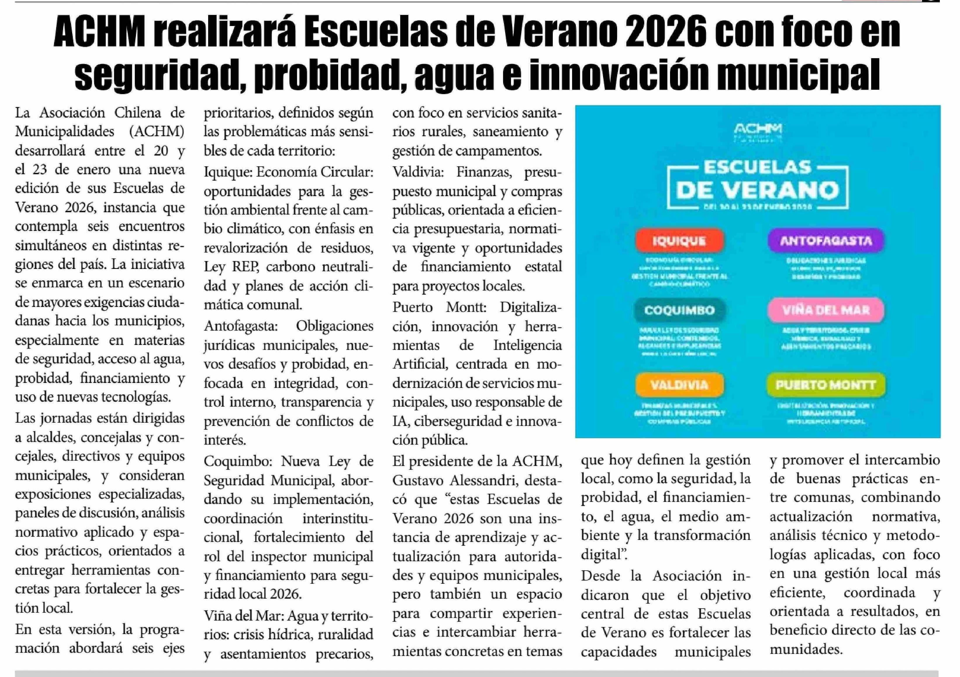 ACHM realizará Escuelas de Verano 2026 con foco en seguridad, probidad, agua e innovación municipal