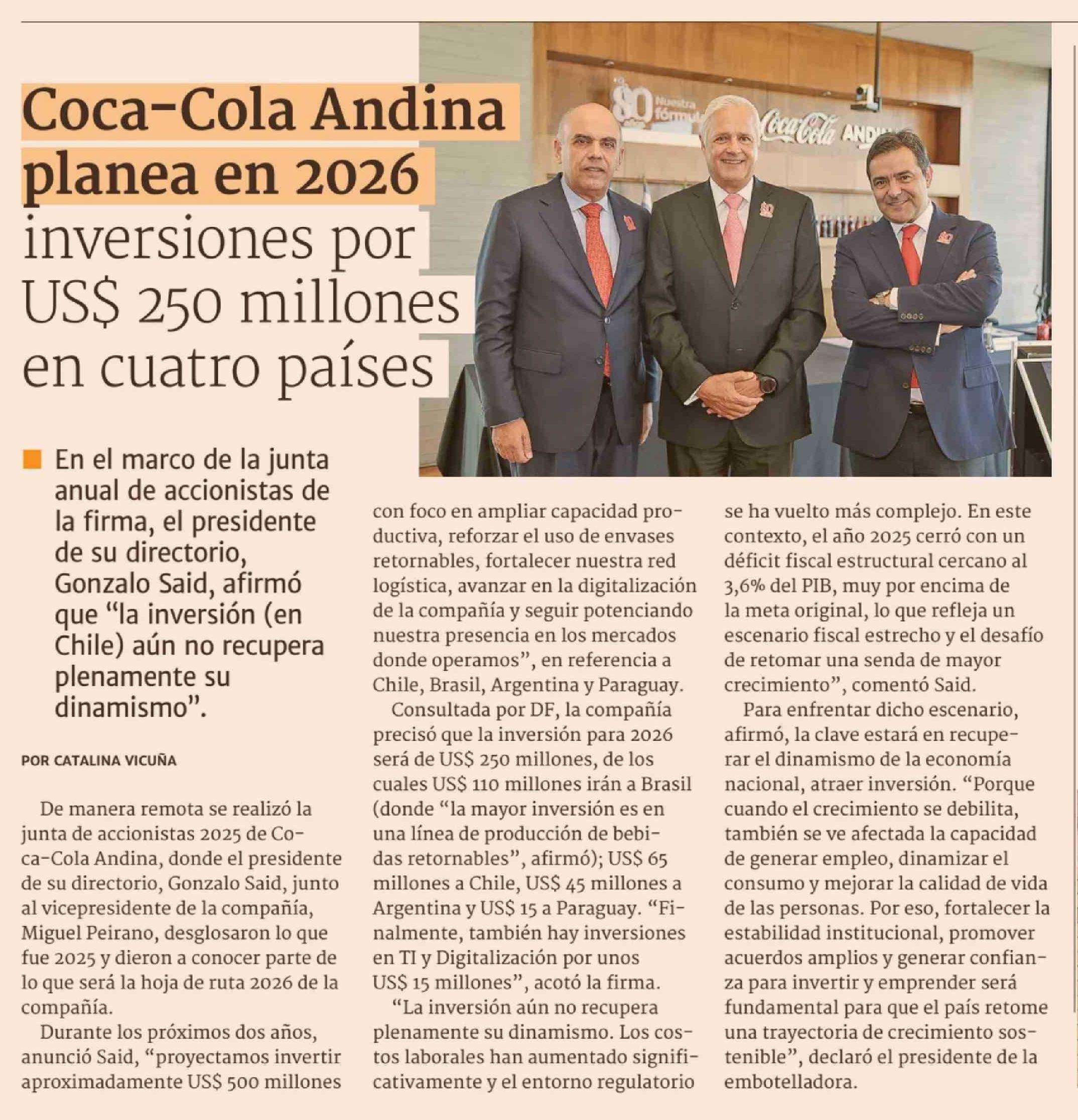 Título: Coca-Cola Andina planea en 2026 inversiones por US$ 250 millones en cuatro países