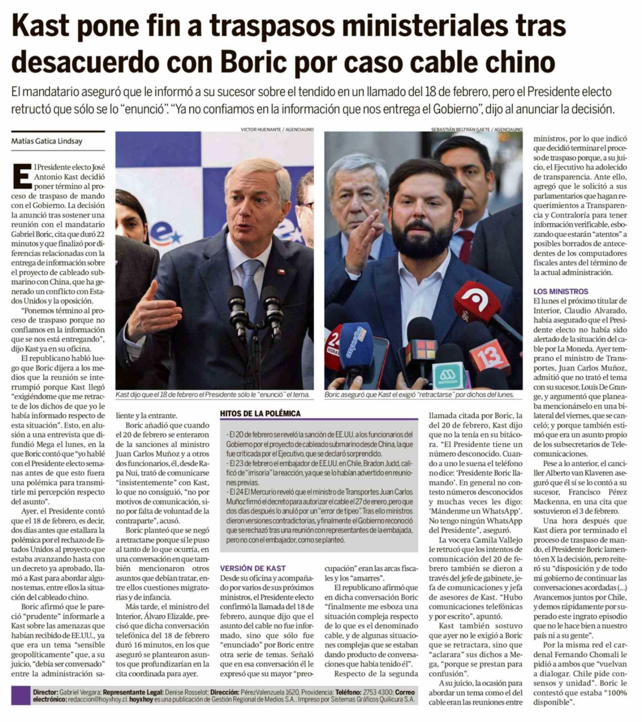 Kast pone fin a traspasos ministeriales tras desacuerdo con Boric por caso cable chino
