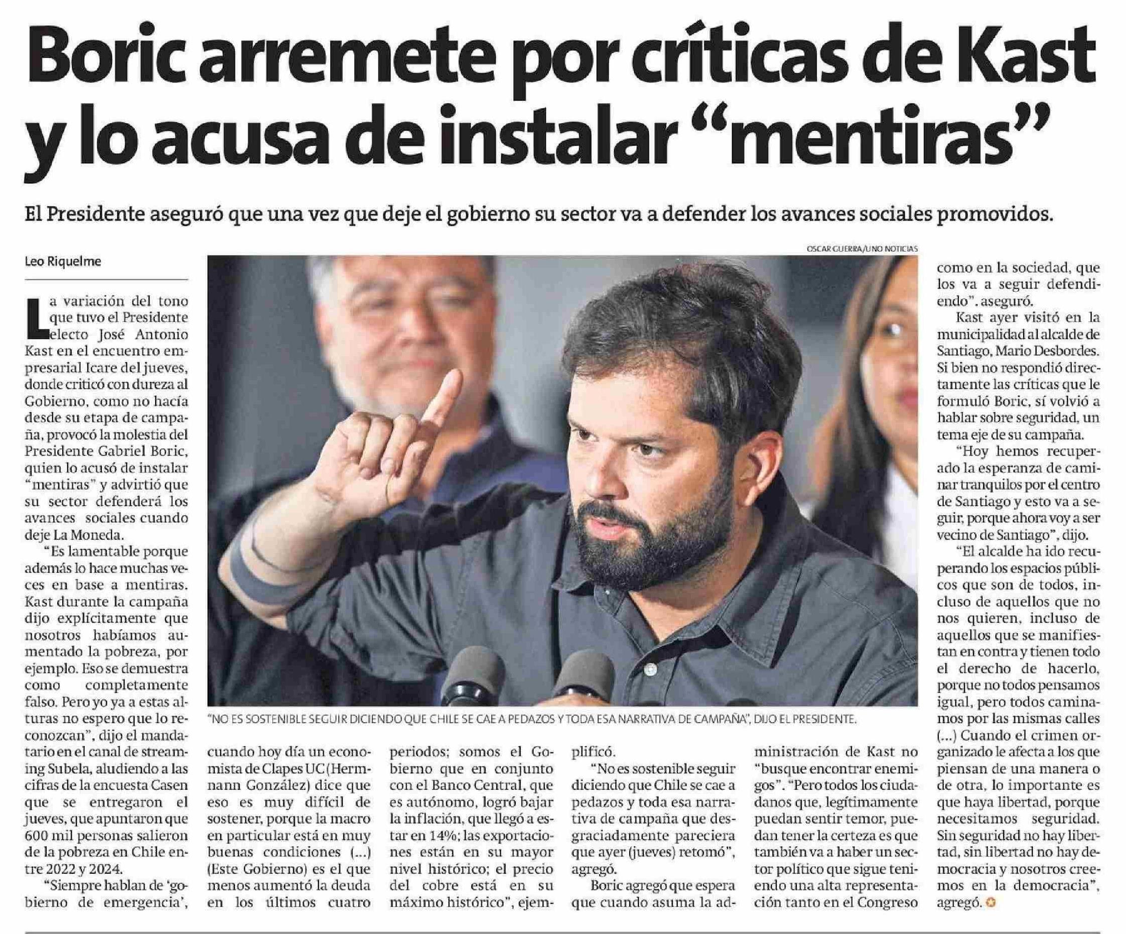 Título: Boric arremete por críticas de Kast y lo acusa de instalar "mentiras"