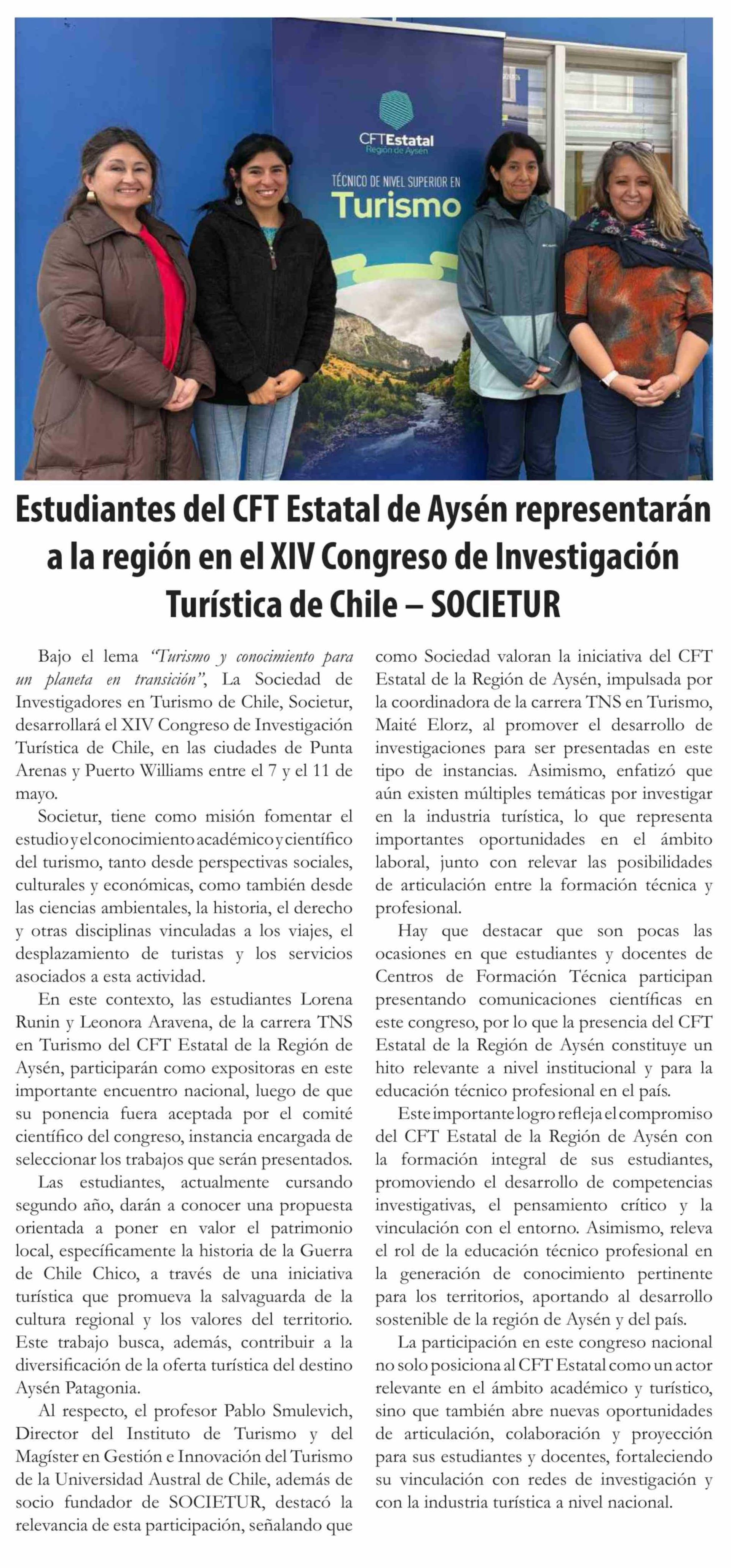 Título: Estudiantes del CFT Estatal de Aysén representarán a la región en el XIV Congreso de Investigación Turística de Chile - SOCIETUR