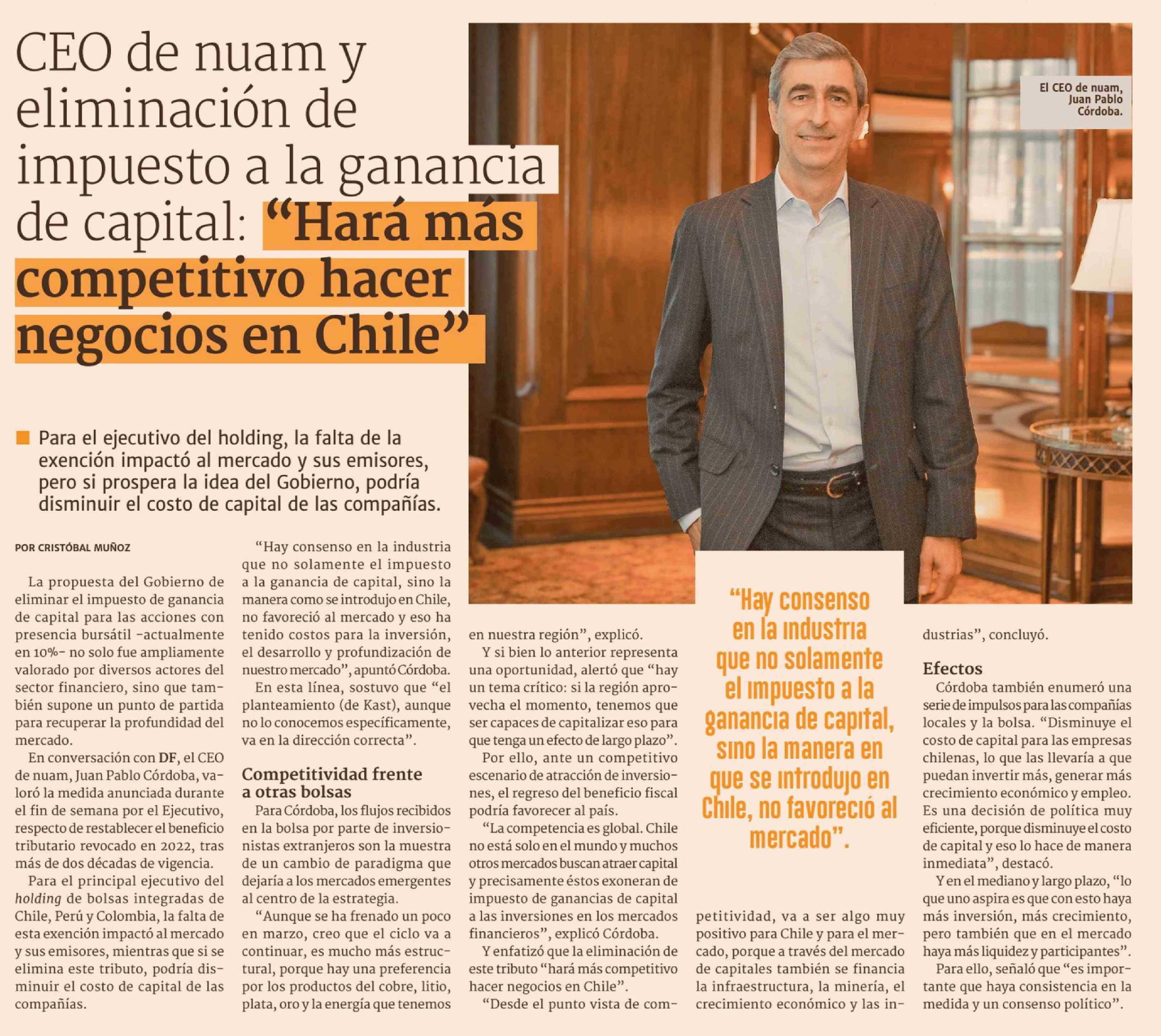 CEO de nuam y eliminación de impuesto a la ganancia de capital: "Hará más competitivo hacer negocios en Chile"