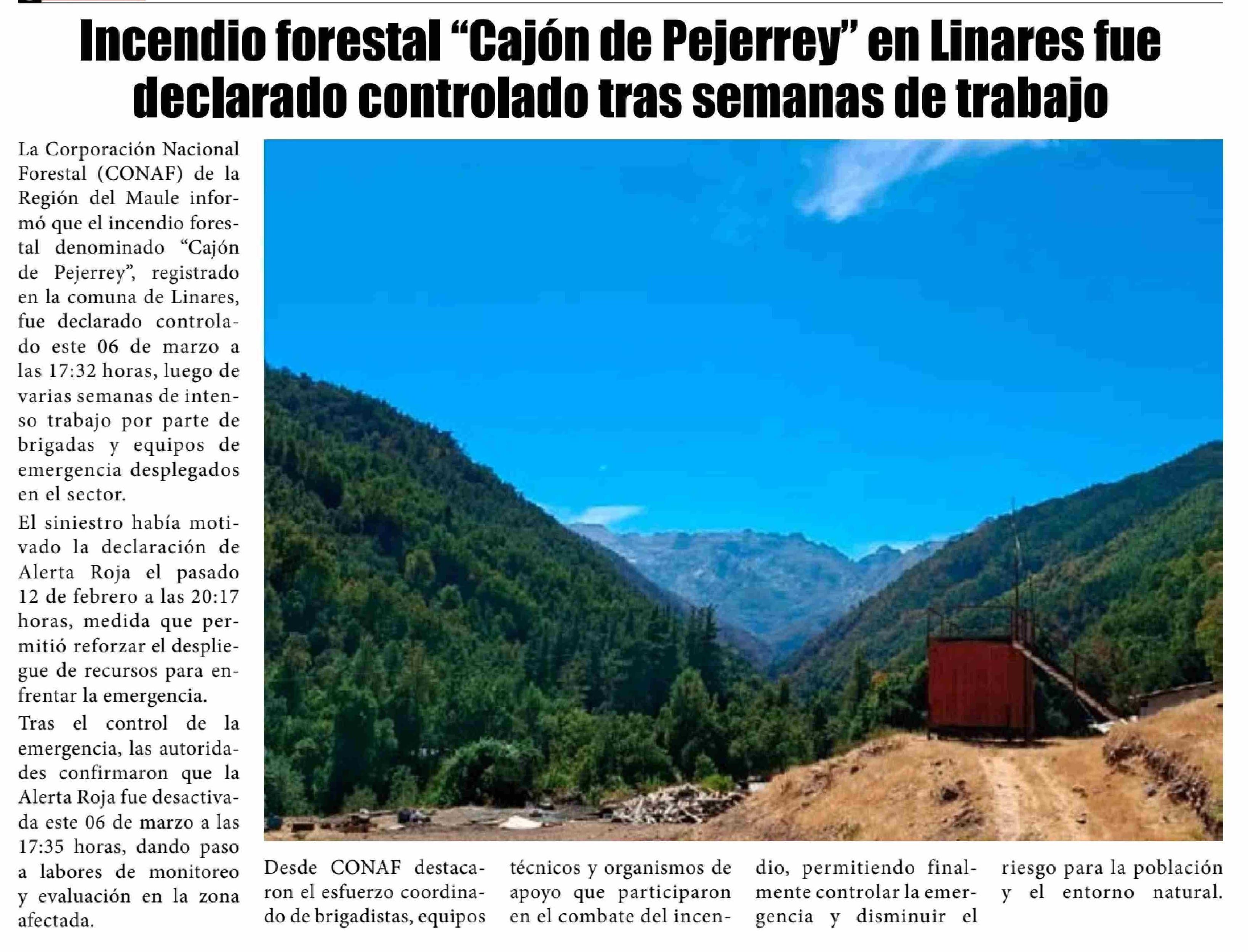 Incendio forestal "Cajón de Pejerrey" en Linares fue declarado controlado tras semanas de trabajo