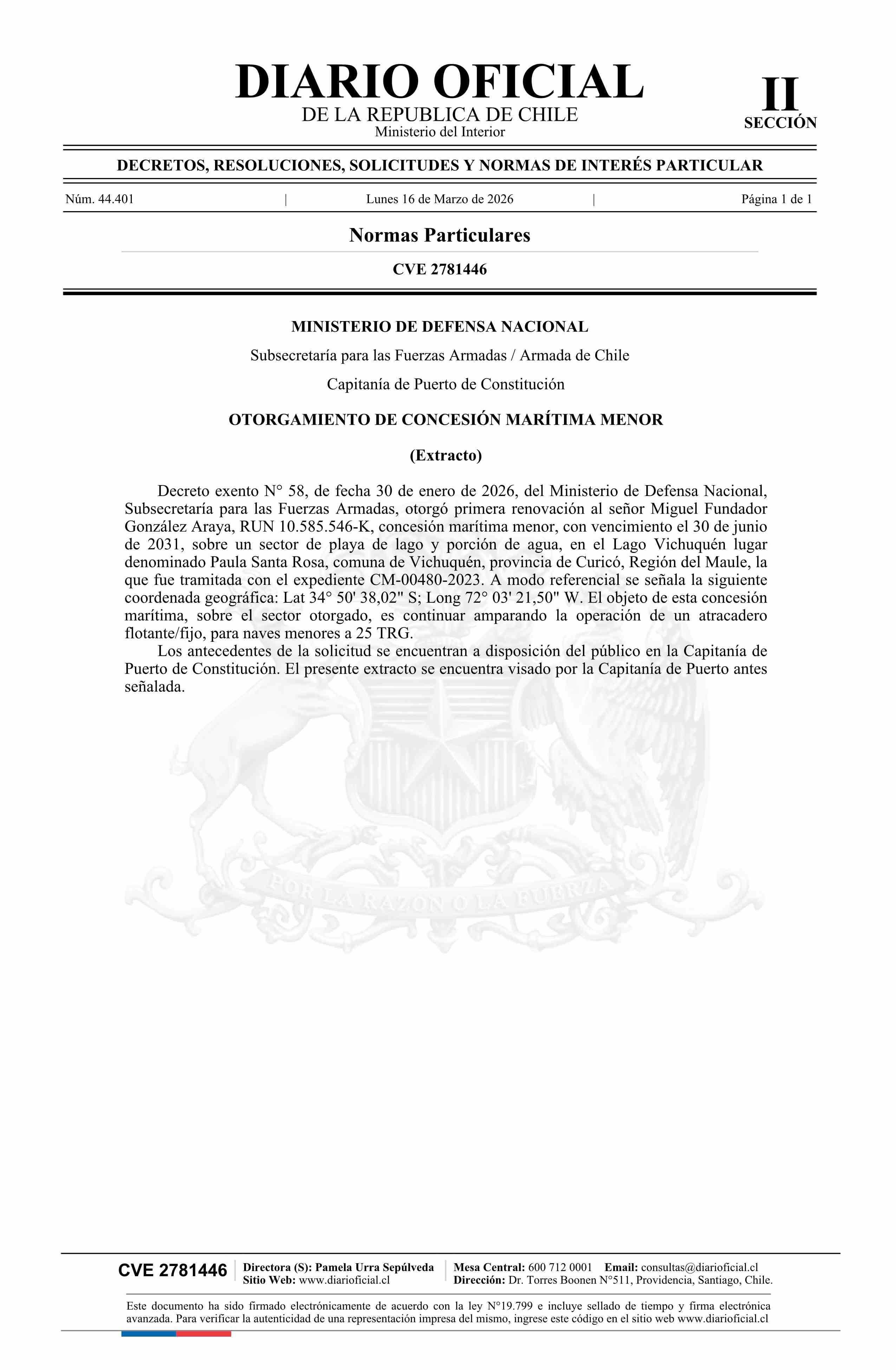 | Título: | Extracto de decreto exento número 58, de 2026.- Otorgamiento de concesión marítima menor |