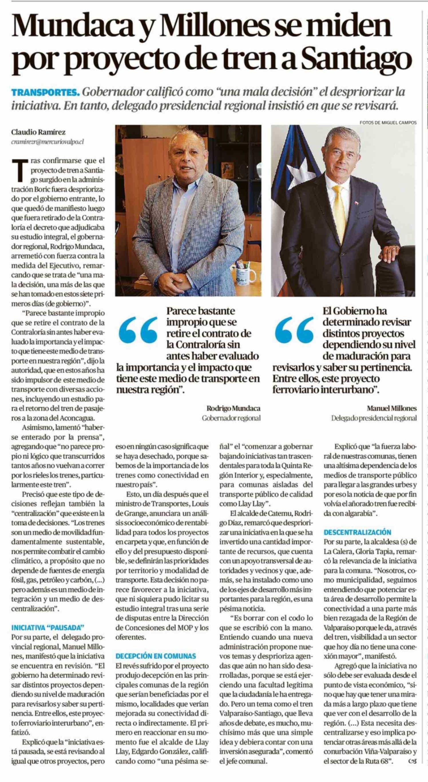 Mundaca y Millones se miden por proyecto de tren a Santiago