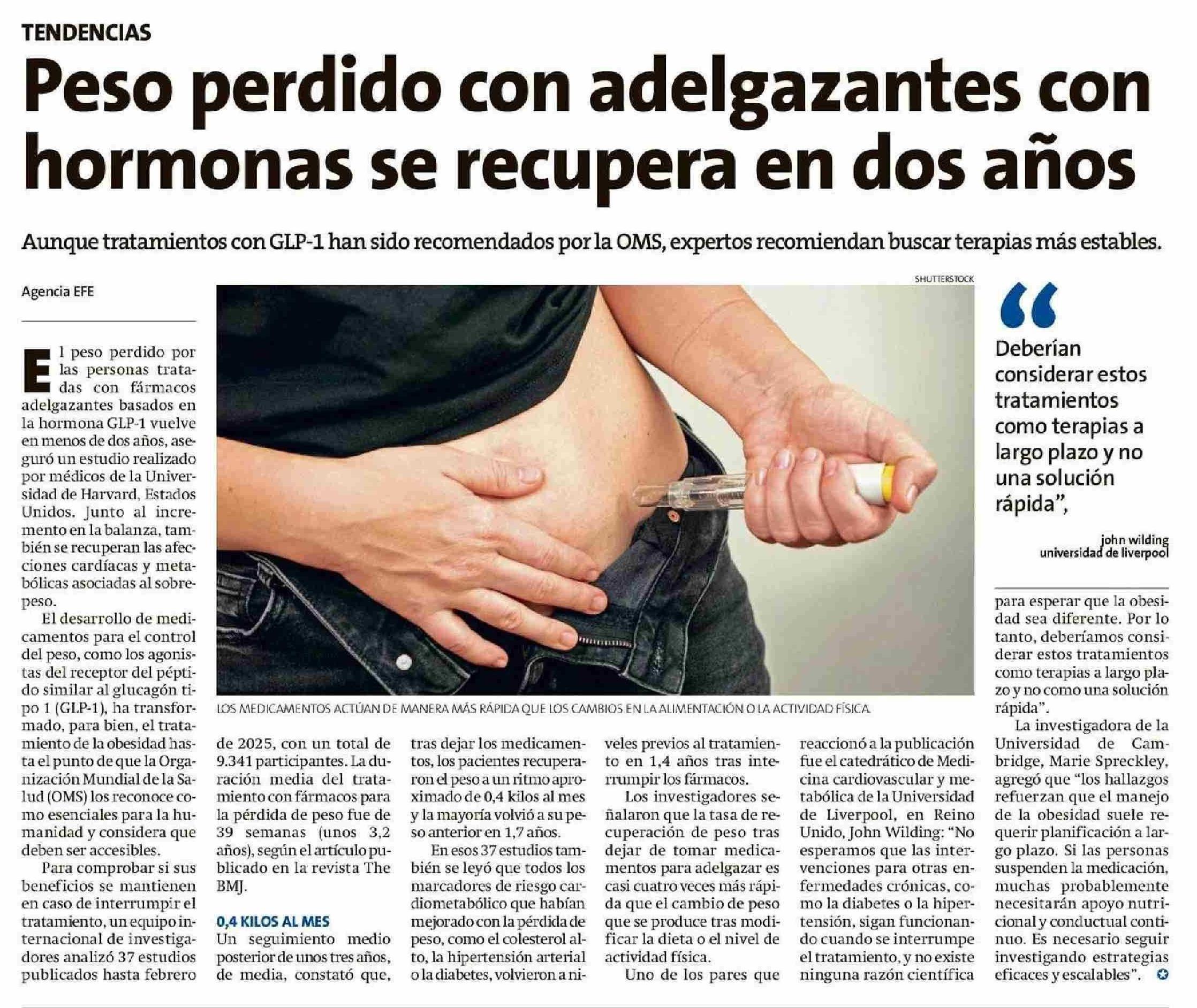 Peso perdido con adelgazantes con hormonas se recupera en dos años