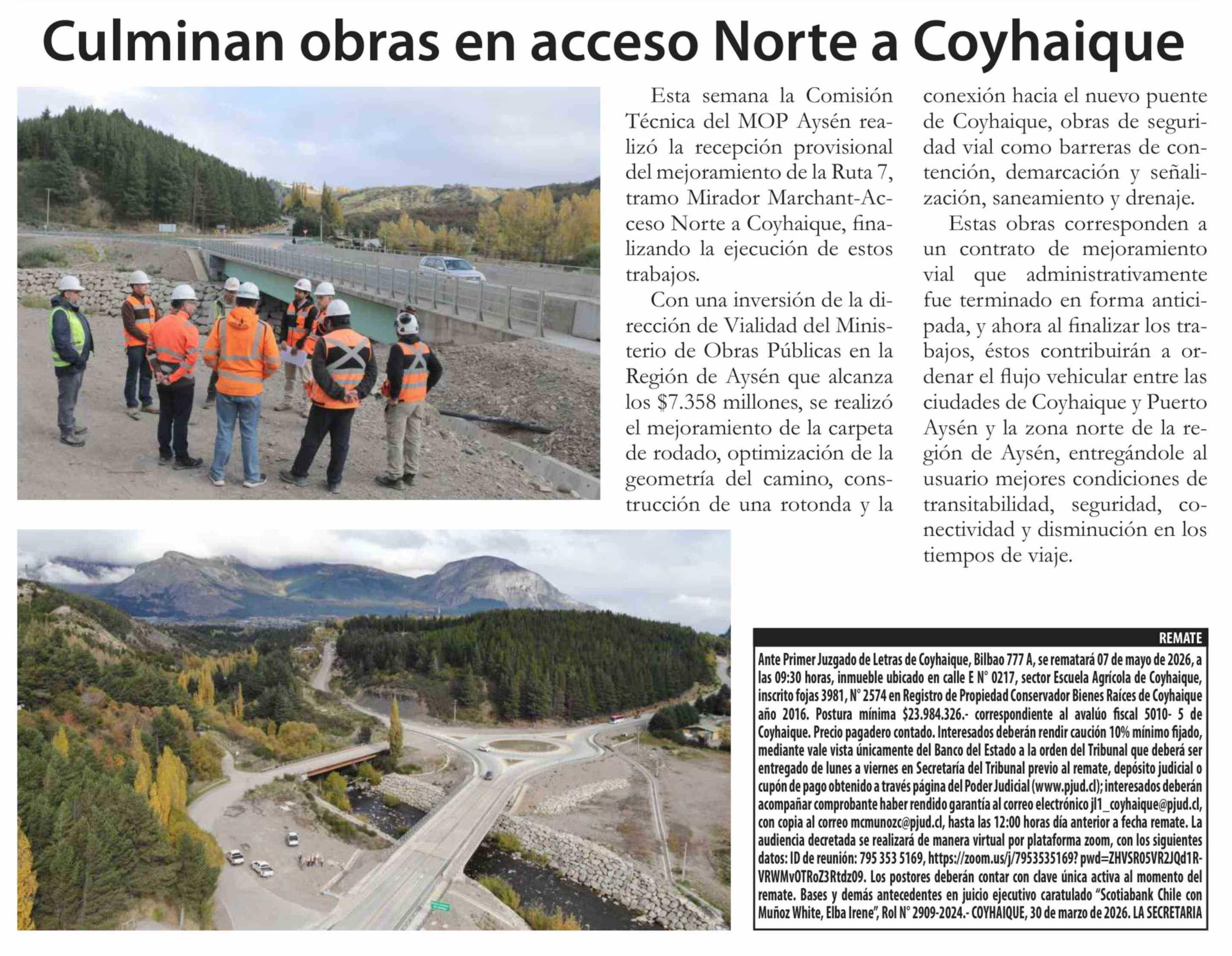 Culminan obras en acceso Norte a Coyhaique