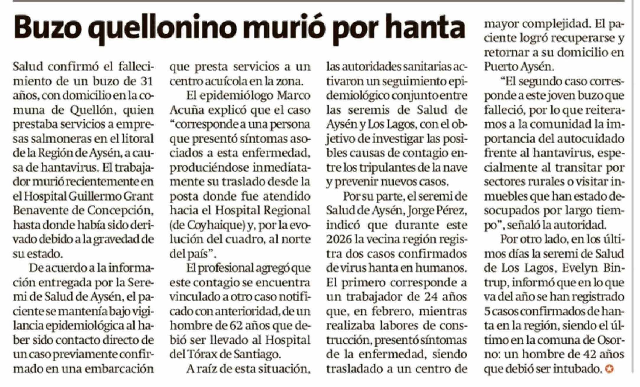 Buzo quellonino murió por hanta