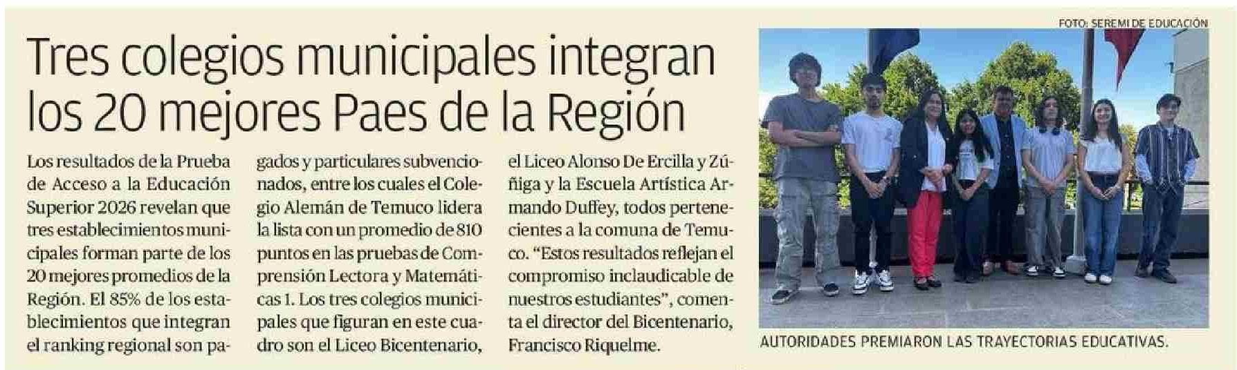 Tres colegios municipales integran los 20 mejores Paes de la Región