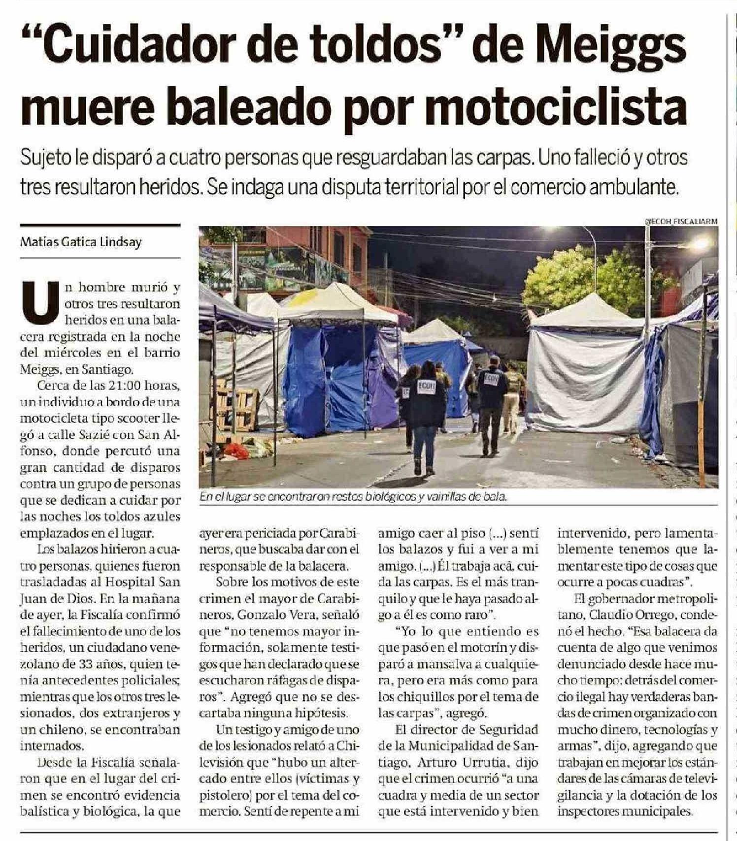 "Cuidador de toldos" de Meiggs muere baleado por motociclista