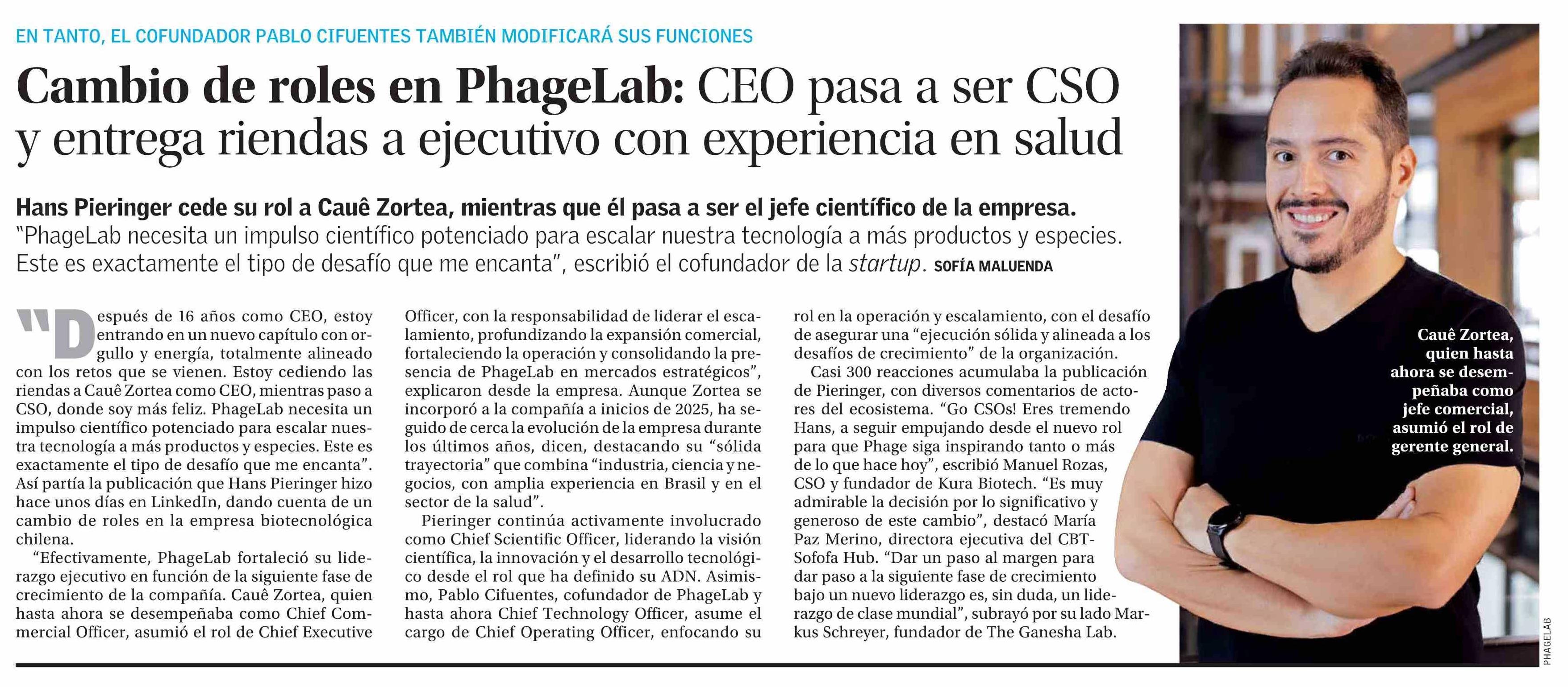Título: Cambio de roles en PhageLab: CEO pasa a ser CSO y entrega riendas a ejecutivo con experiencia en salud