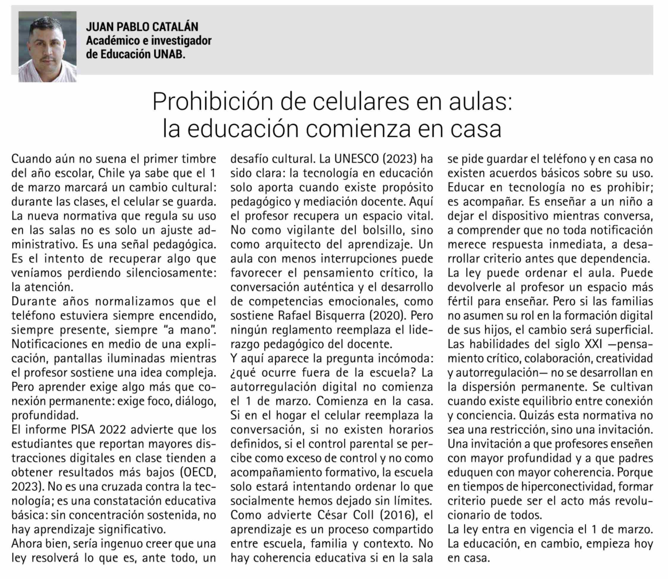 Columnas de Opinión: Prohibición de celulares en aulas: la educación comienza en casa