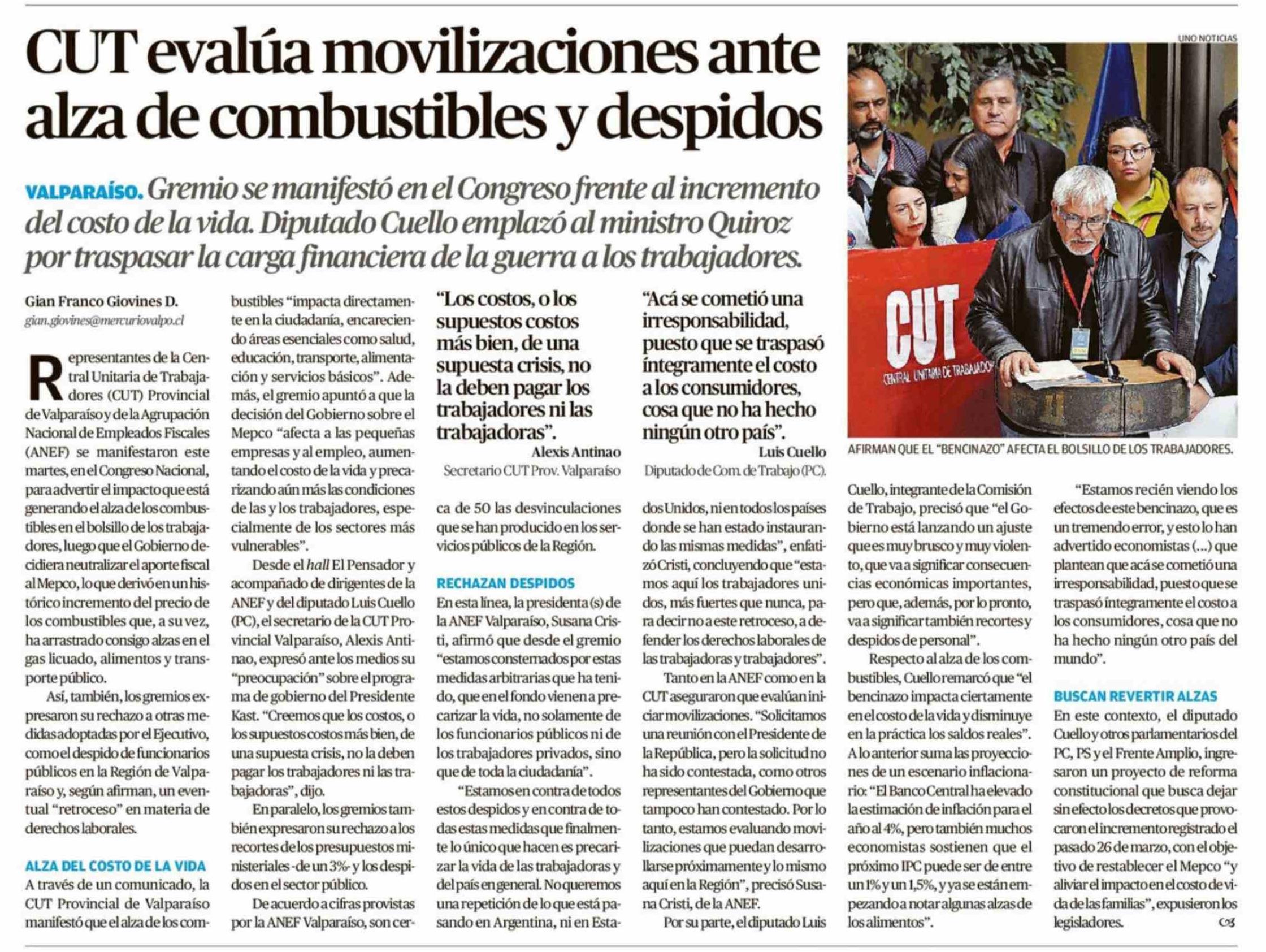 CUT evalúa movilizaciones ante alza de combustibles y despidos