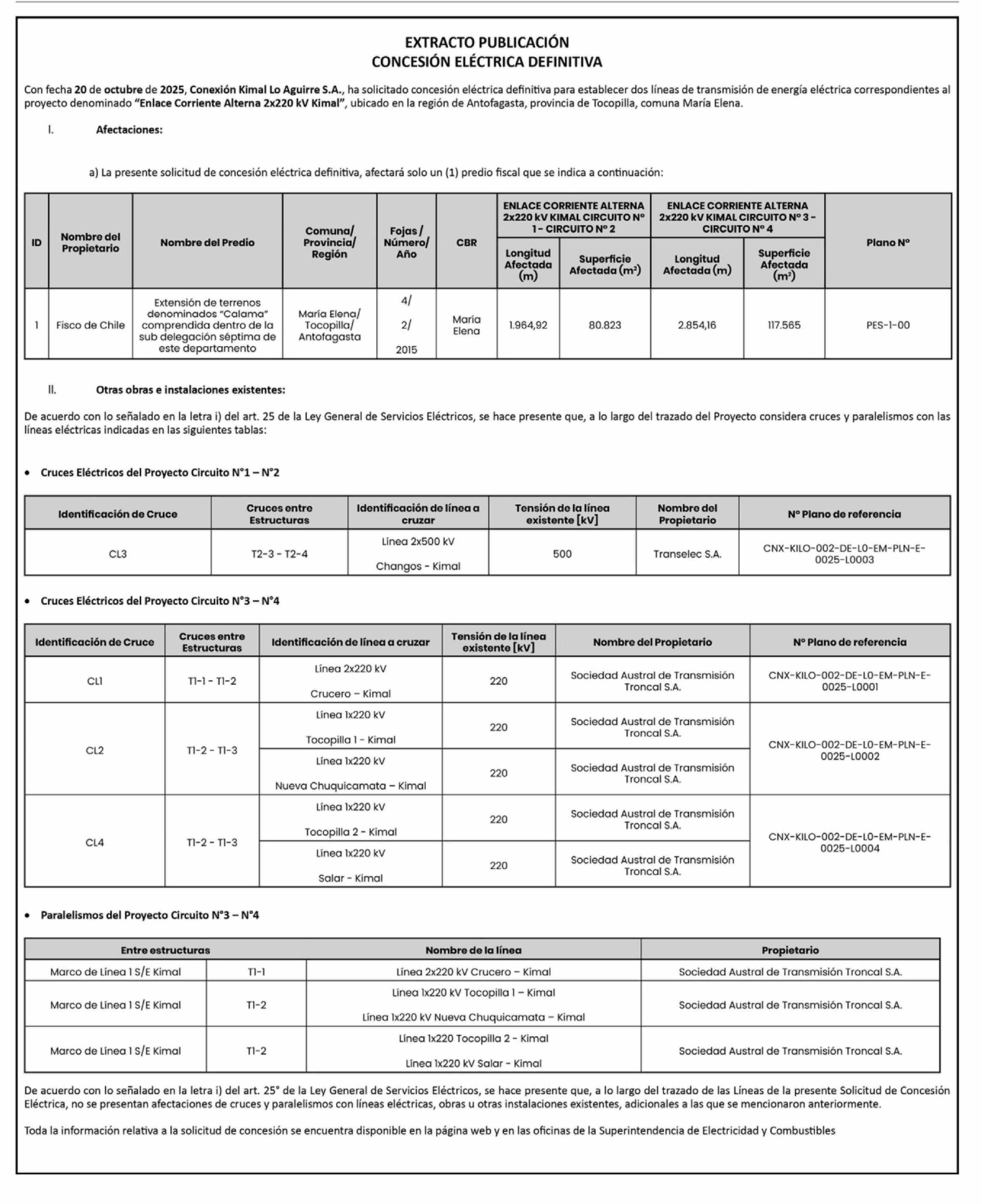Título: Extractos: EXTRACTO PUBLICACIÓN CONCESIÓN ELÉCTRICA DEFINITIVA Con fecha 20 de octubre de 2025, Conexión Kimal Lo Aguirre S.A., ha solicitado concesión eléctrica definitiva para establecer dos líneas de transmisión de energía eléctrica correspondientes al proyecto denominado "Enlace Corriente Altern